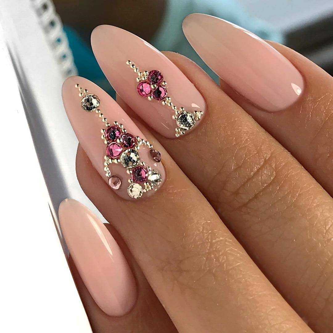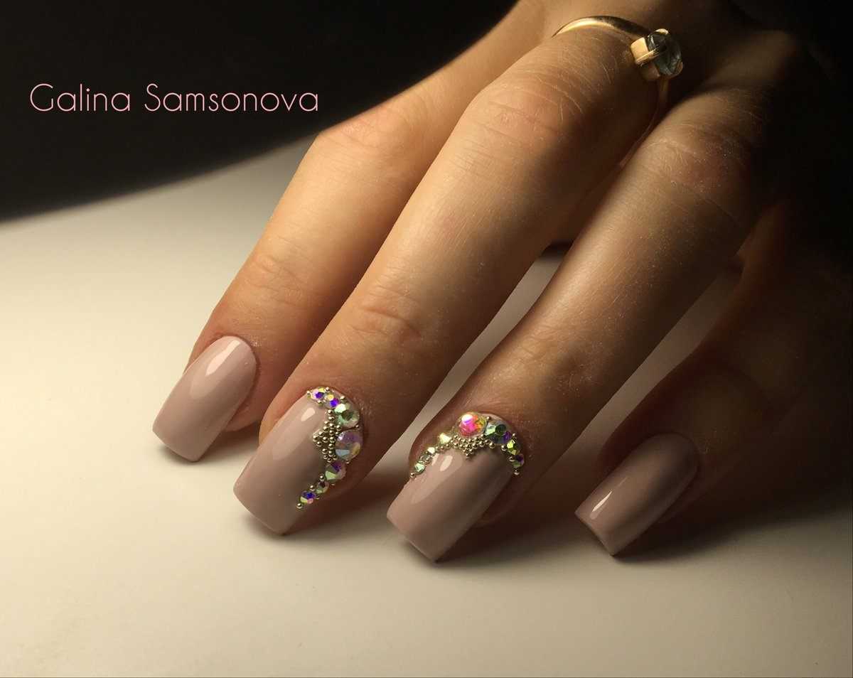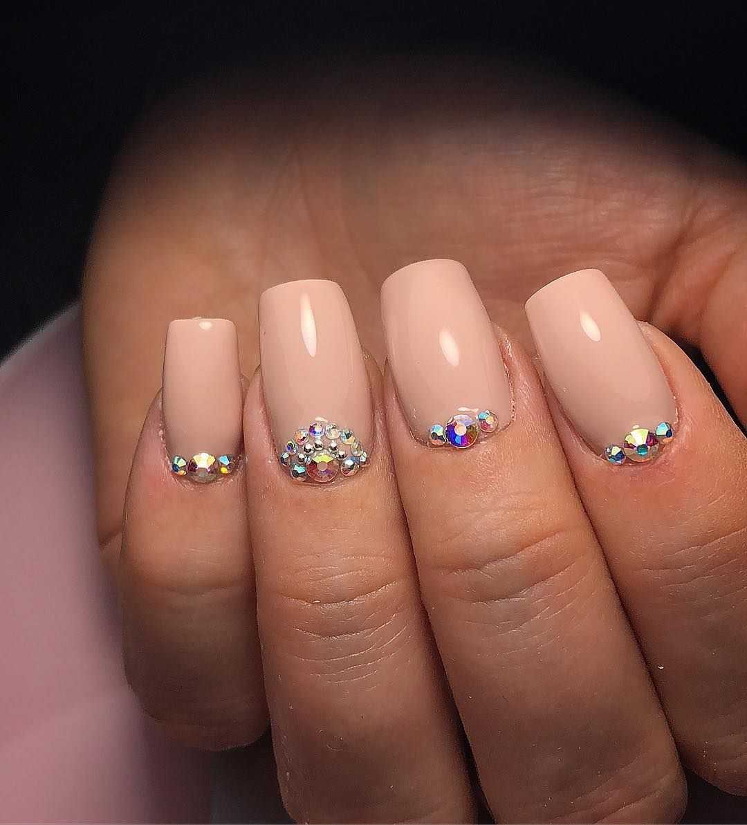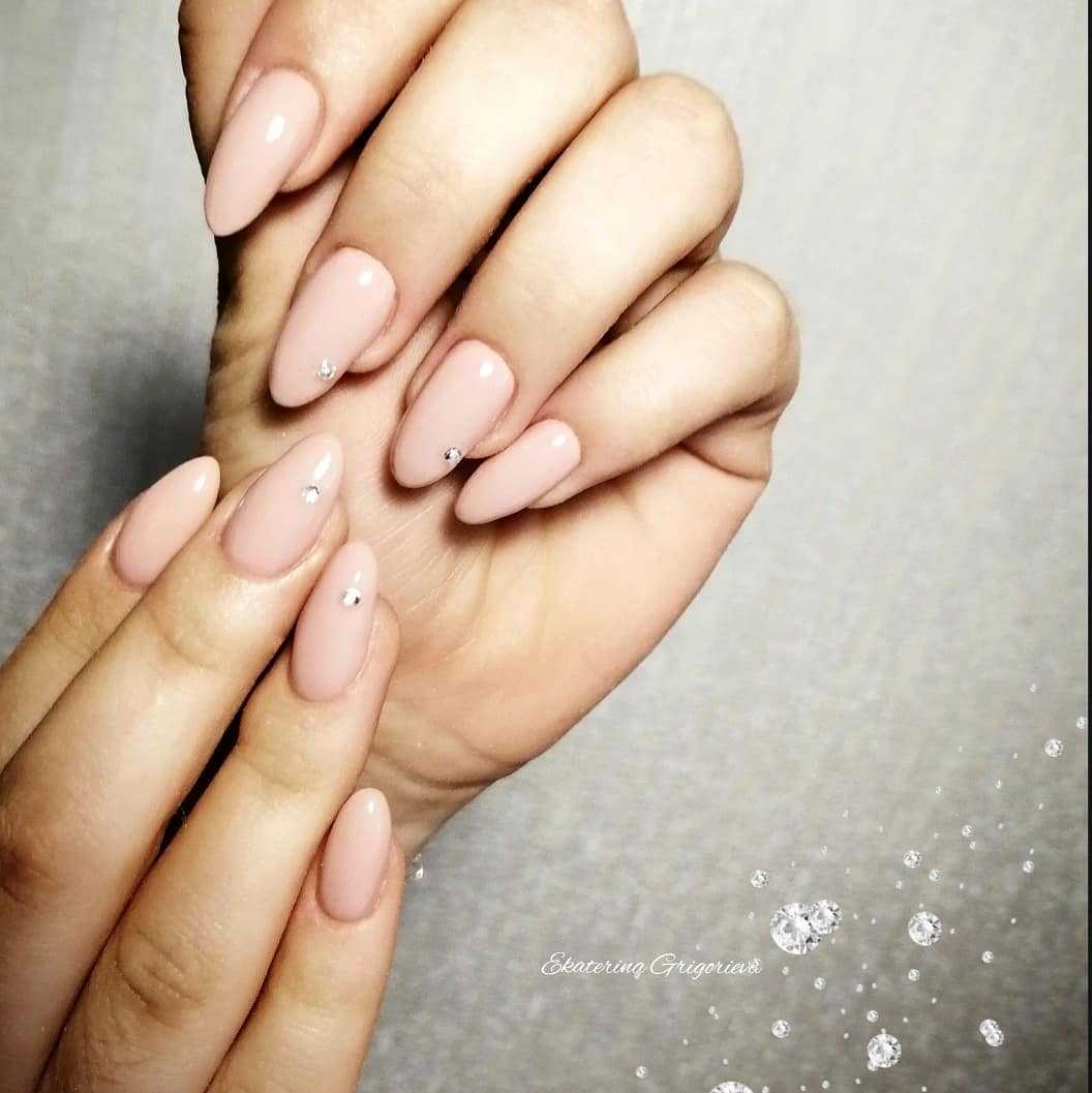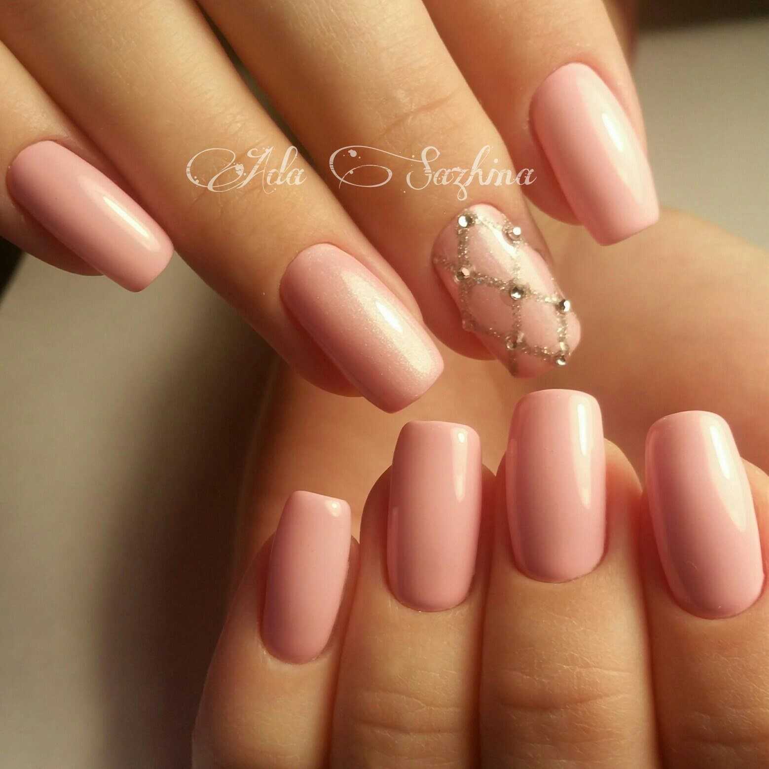 Нюдовый маникюр. Такой оттенок не требует дополнительного декора, хотя тонкие полоски скотча или стразы и полубусины сделают этот маникюр манящим и загадочным.