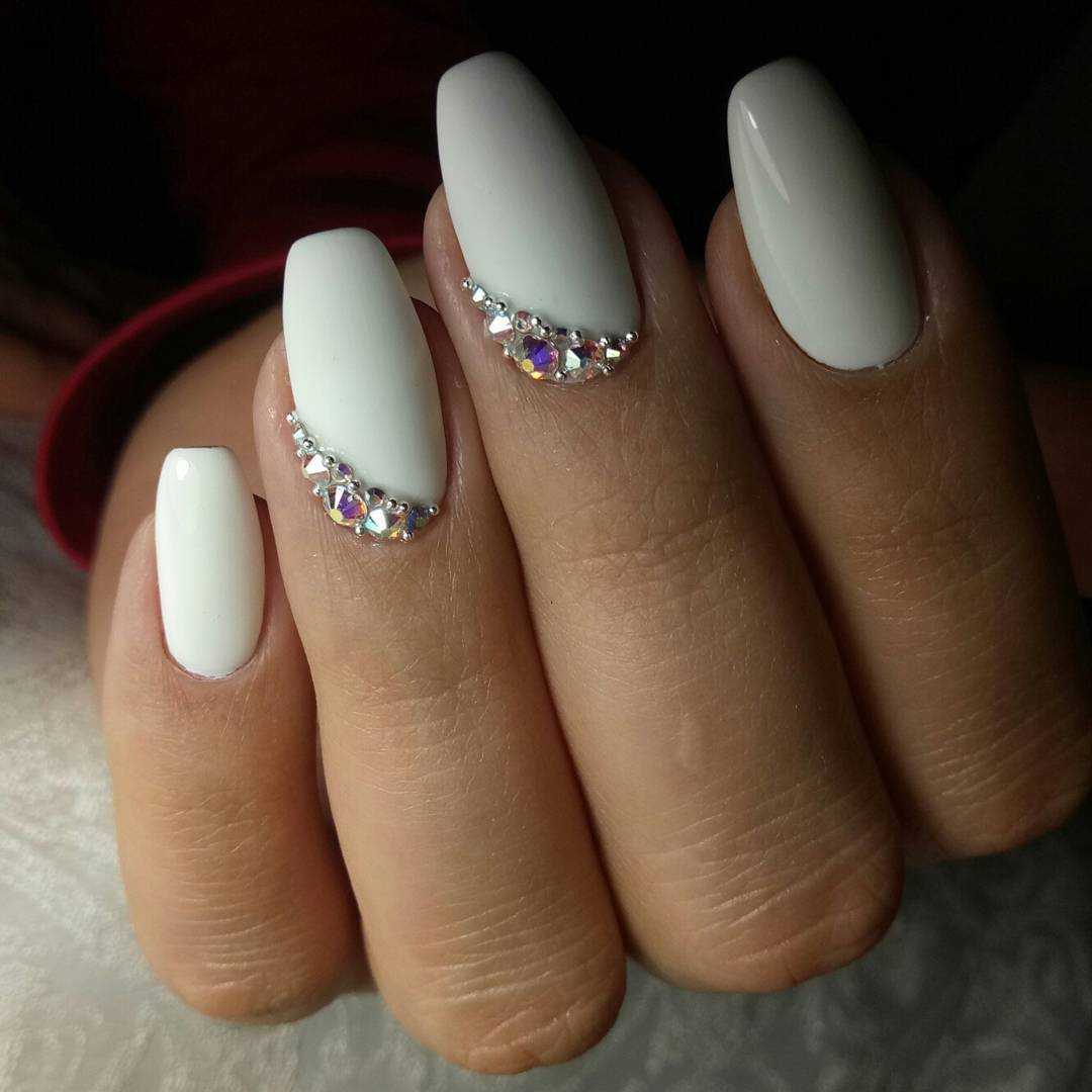 Нарощенные однотонные ногти могут допускать наличие на покрытии маленьких страз или наклеек. Так и весь дизайн нарощенных ногтей может содержать в себе любые украшения в этой гамме оттенков: