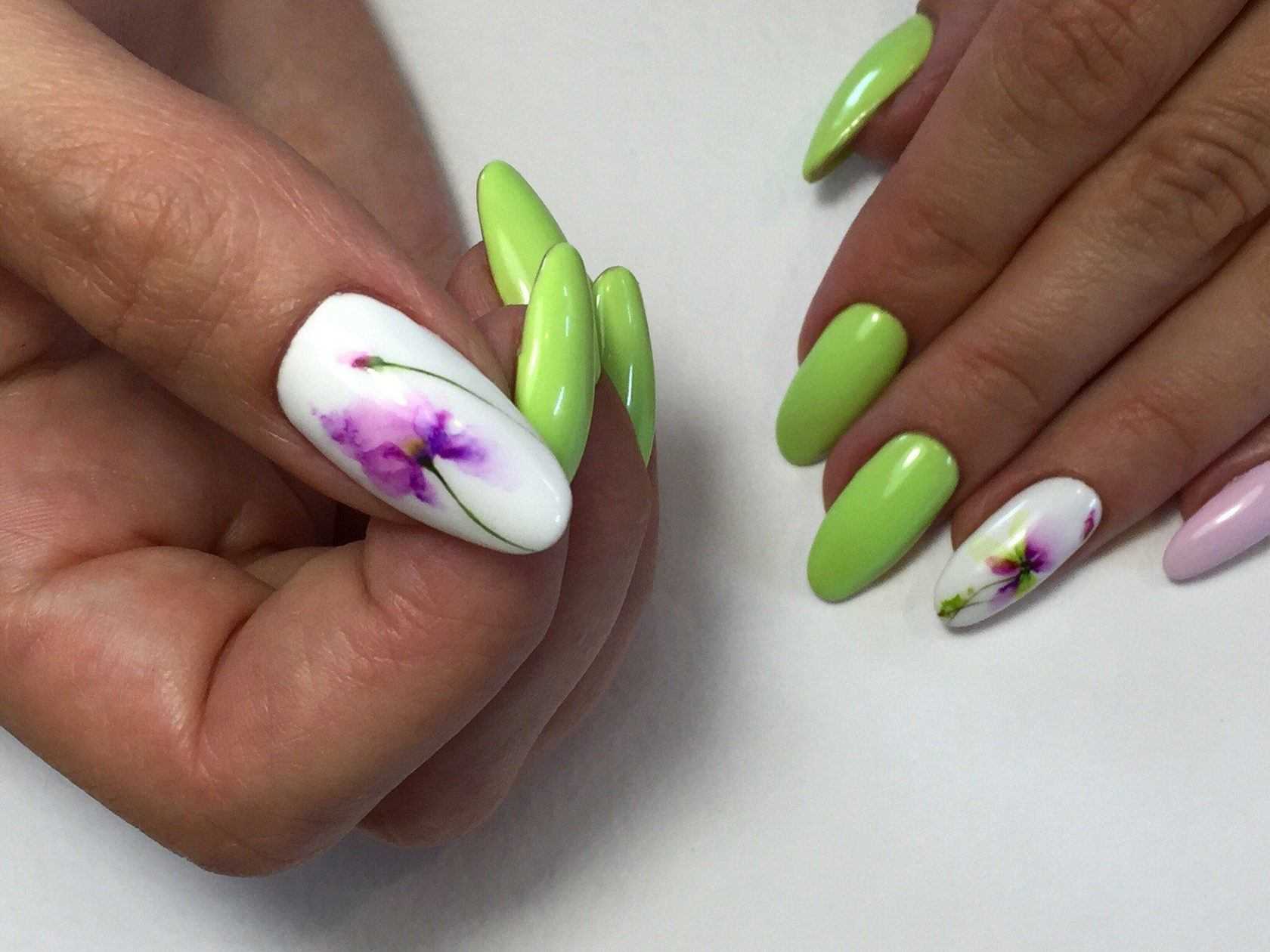 В весеннее время в тренде флористические мотивы. Выбирают нежные пастельные тона, например: сиреневый, нежно-желтый, мятно-зеленый. Можно рисовать цветочные узоры на базовом покрытии пастельного тона, можно использовать наклейки или стемпинг. Неплохо будет смотреться градиент из весенней цветовой гаммы. Посмотрите некоторые идеи для вдохновения на примере фото.