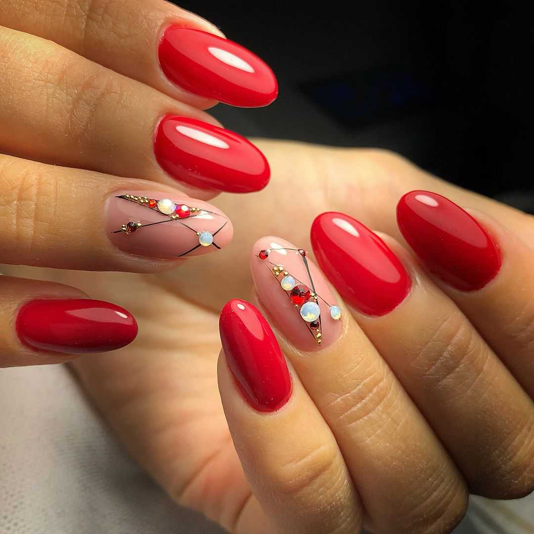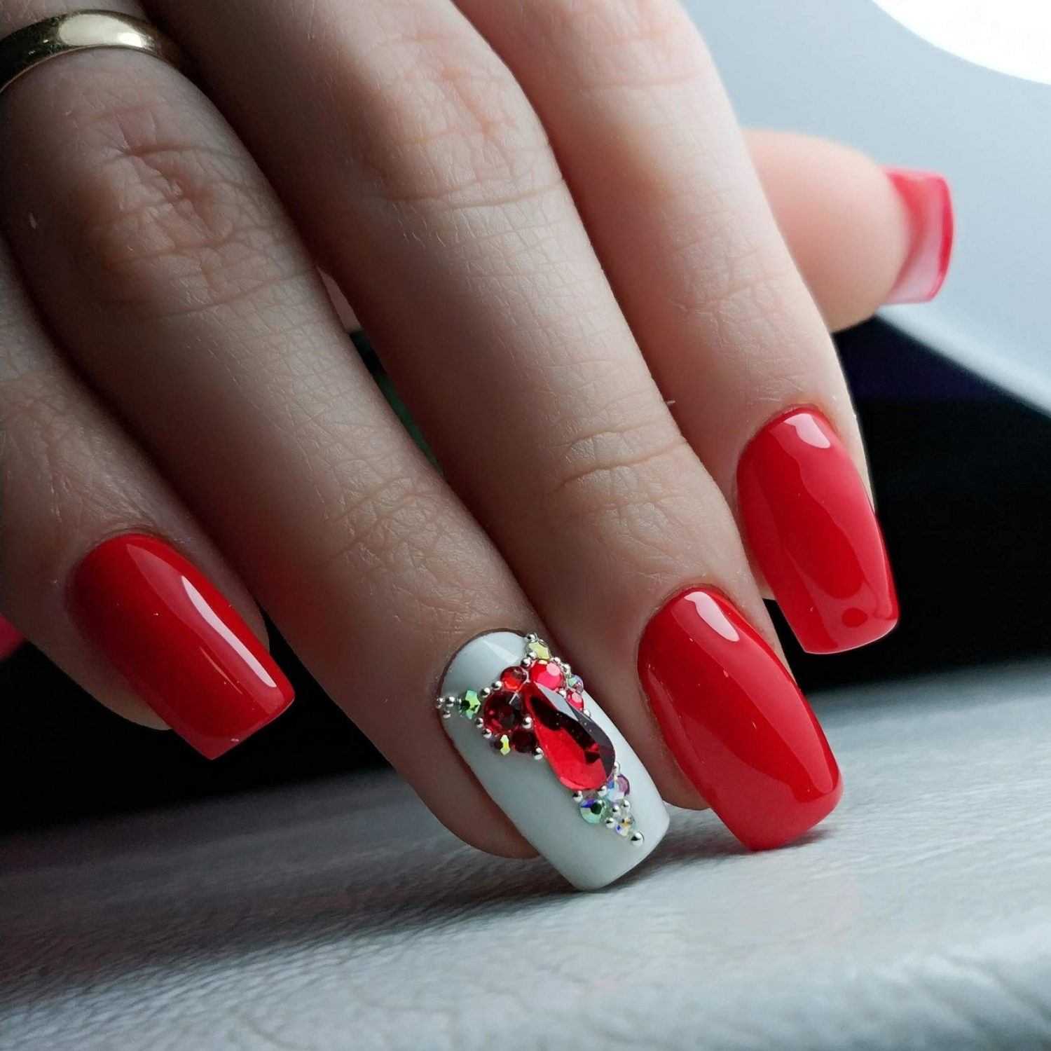 Красивый праздничный маникюр 2022-2023 невозможно представить без декоративных элементов. Белый жемчуг на алом или вишневом покрытии придает образу оттенок аристократизма. Популярный дизайн ногтей со стразами стильно представлен в красно-белом исполнении. На акцентные ноготки наносят стразы красного или белого цвета в зависимости от фона.