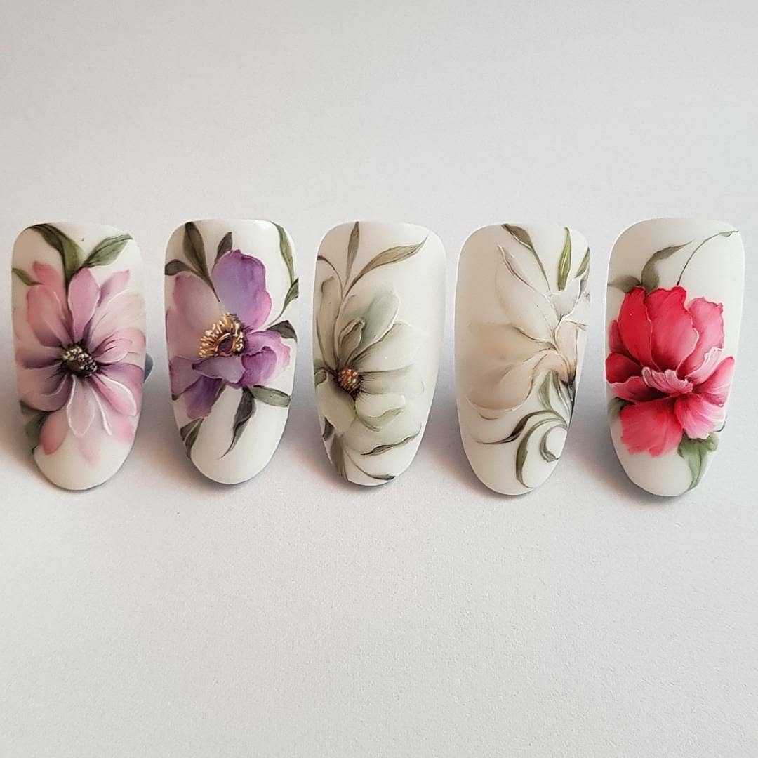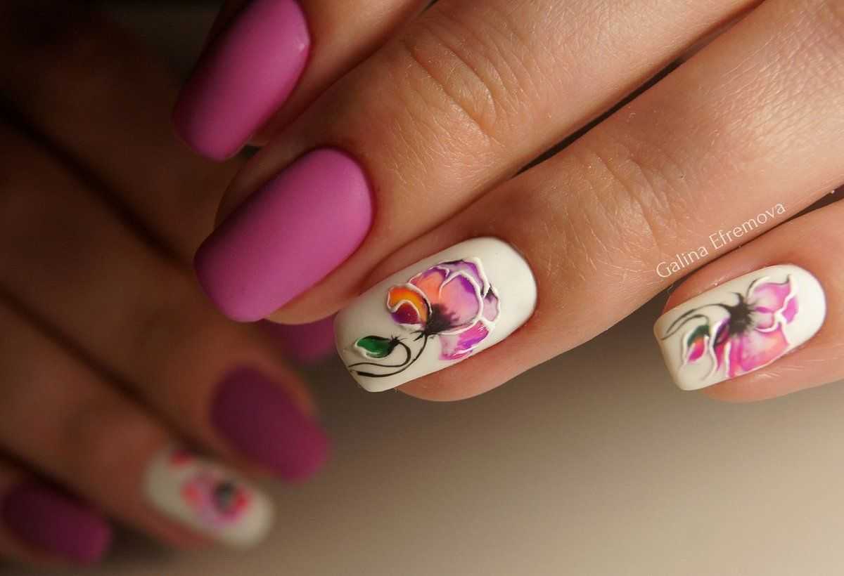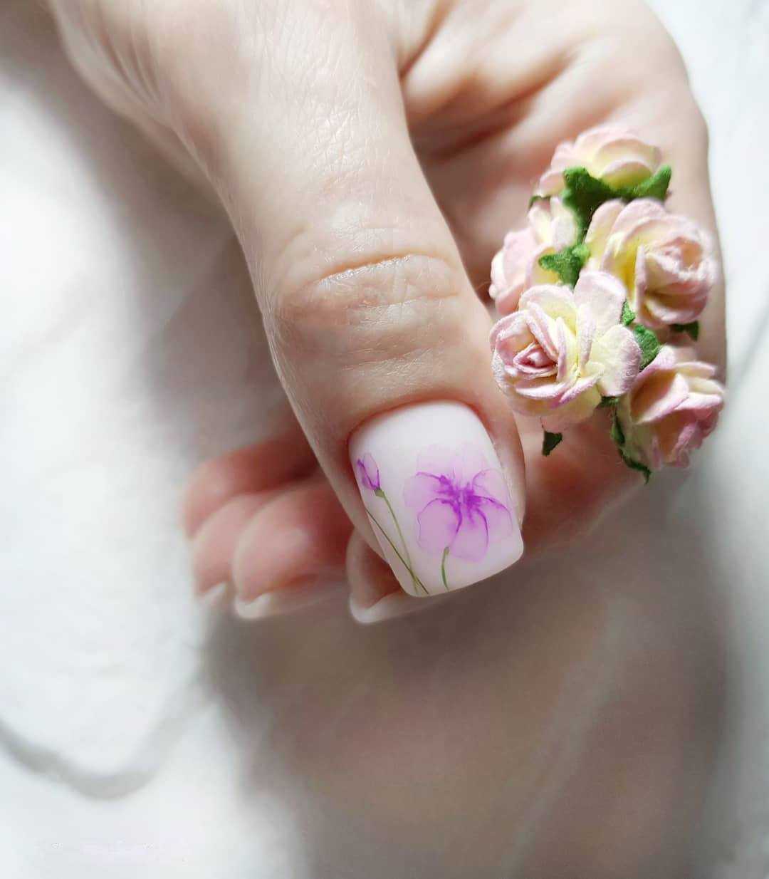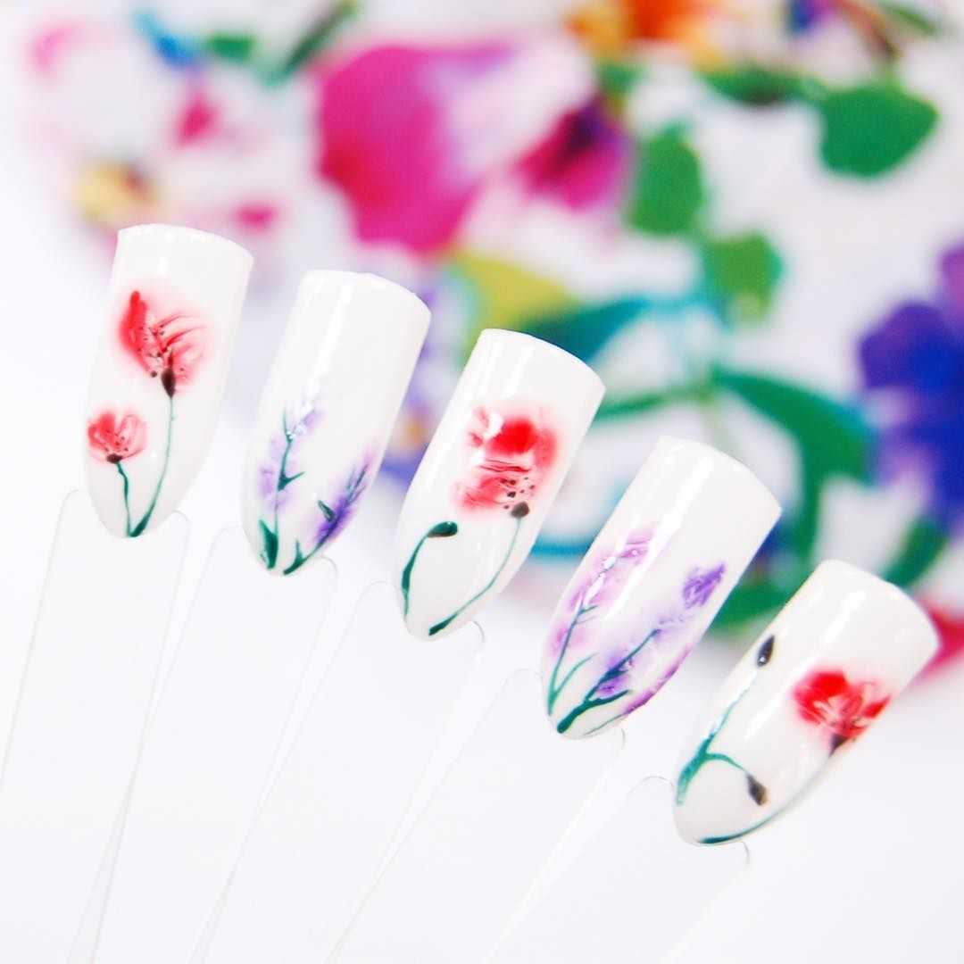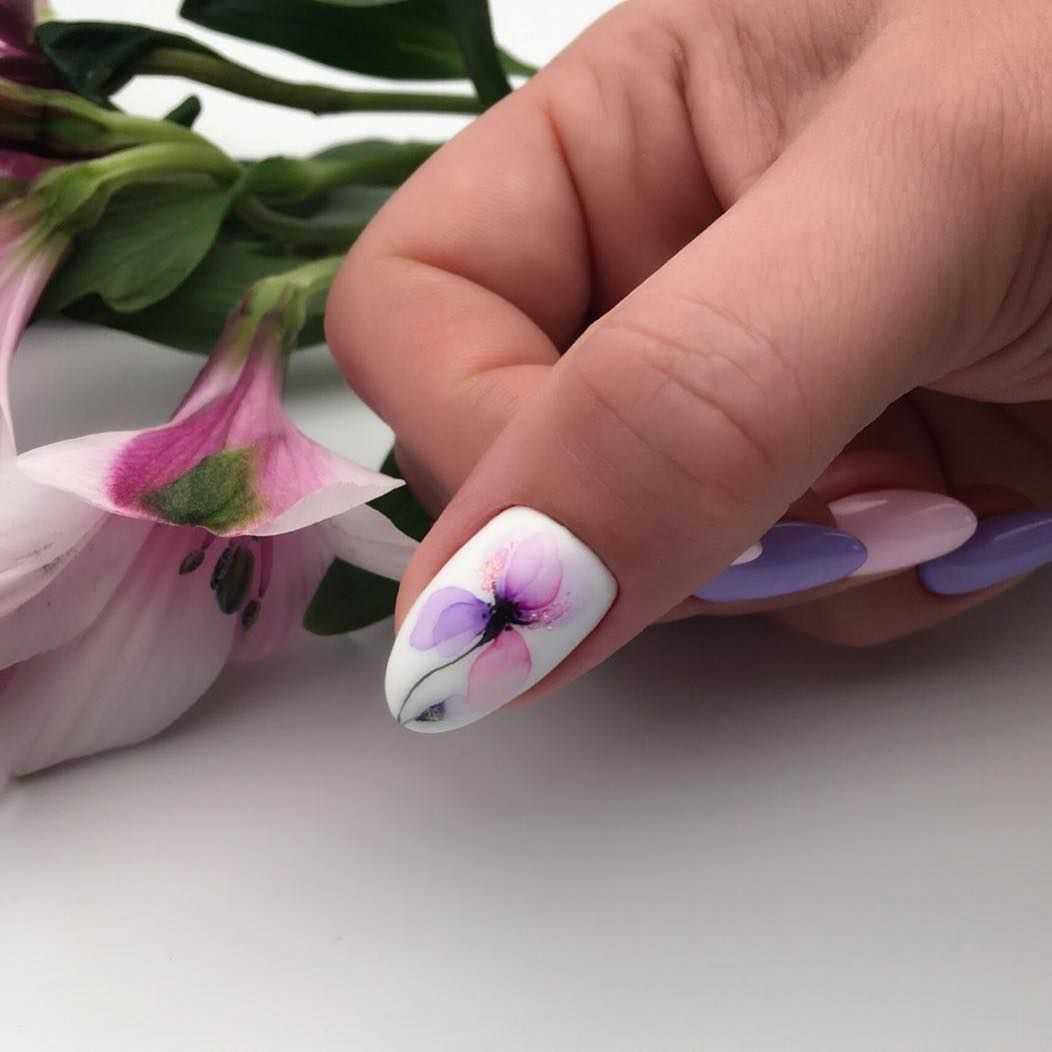 Уже многие годы цветочный рисунок – едва ли не самый популярный вид дизайна для ногтей. Его используют в качестве украшения френча, однотонного покрытия и многих других вариантов оформления. Поэтому не удивительно, что цветы все чаще наносят в акварельной технике. Это позволяет смешивать оттенки в желанных пропорциях, чтобы добиться подходящих тонов. Примечательно, что данная техника не предполагает многослойного нанесения красок. Поскольку главное – тщательно их наносить, не допуская проплешин.
