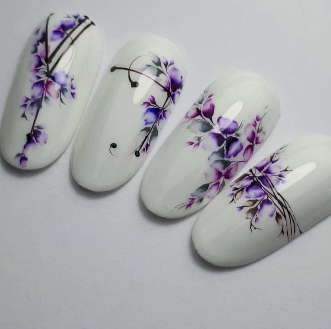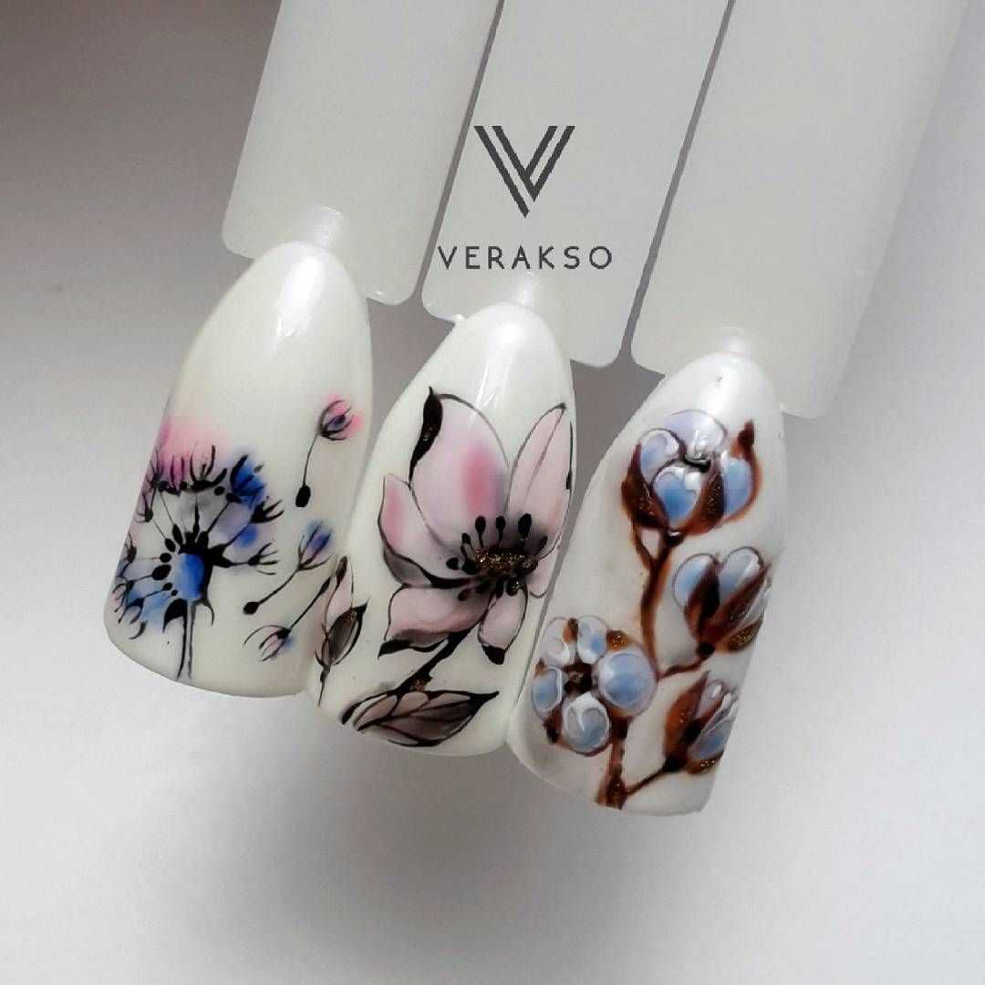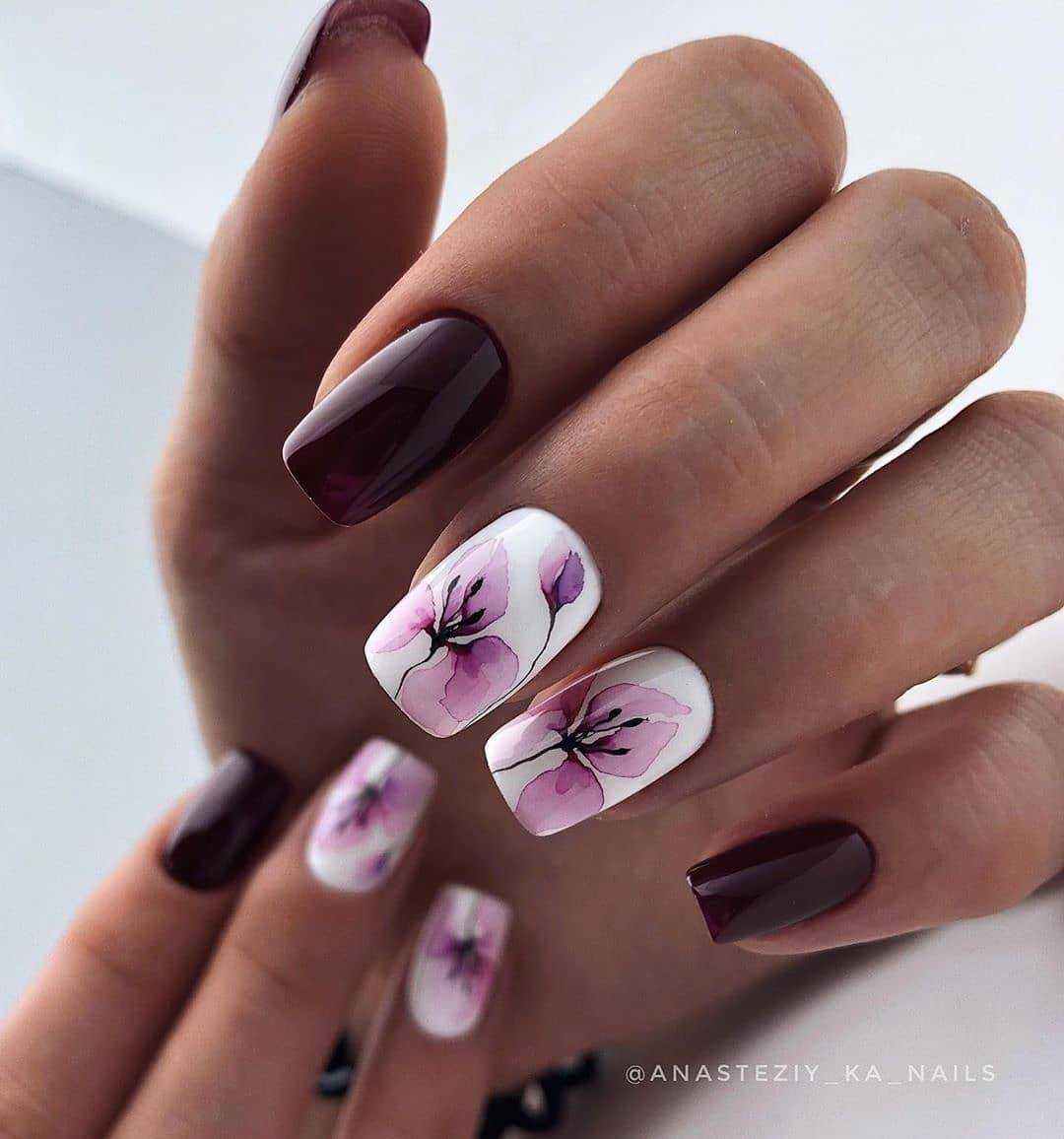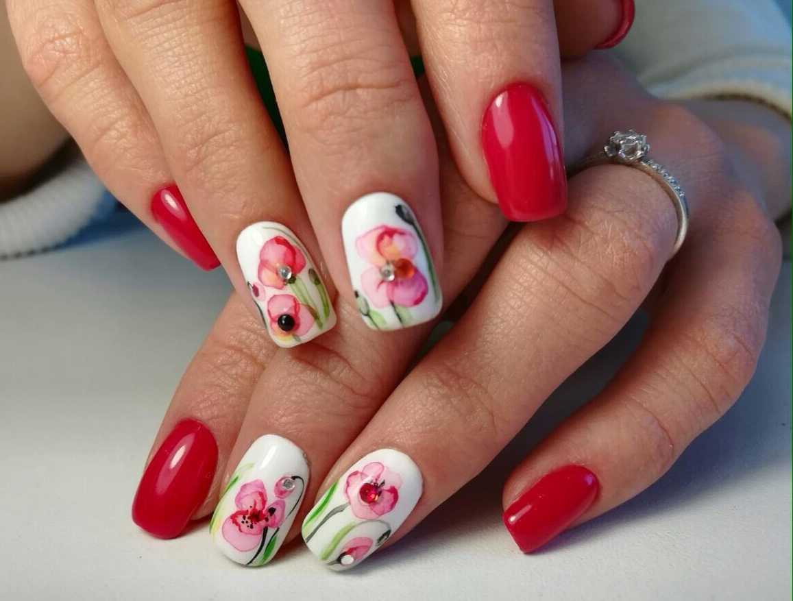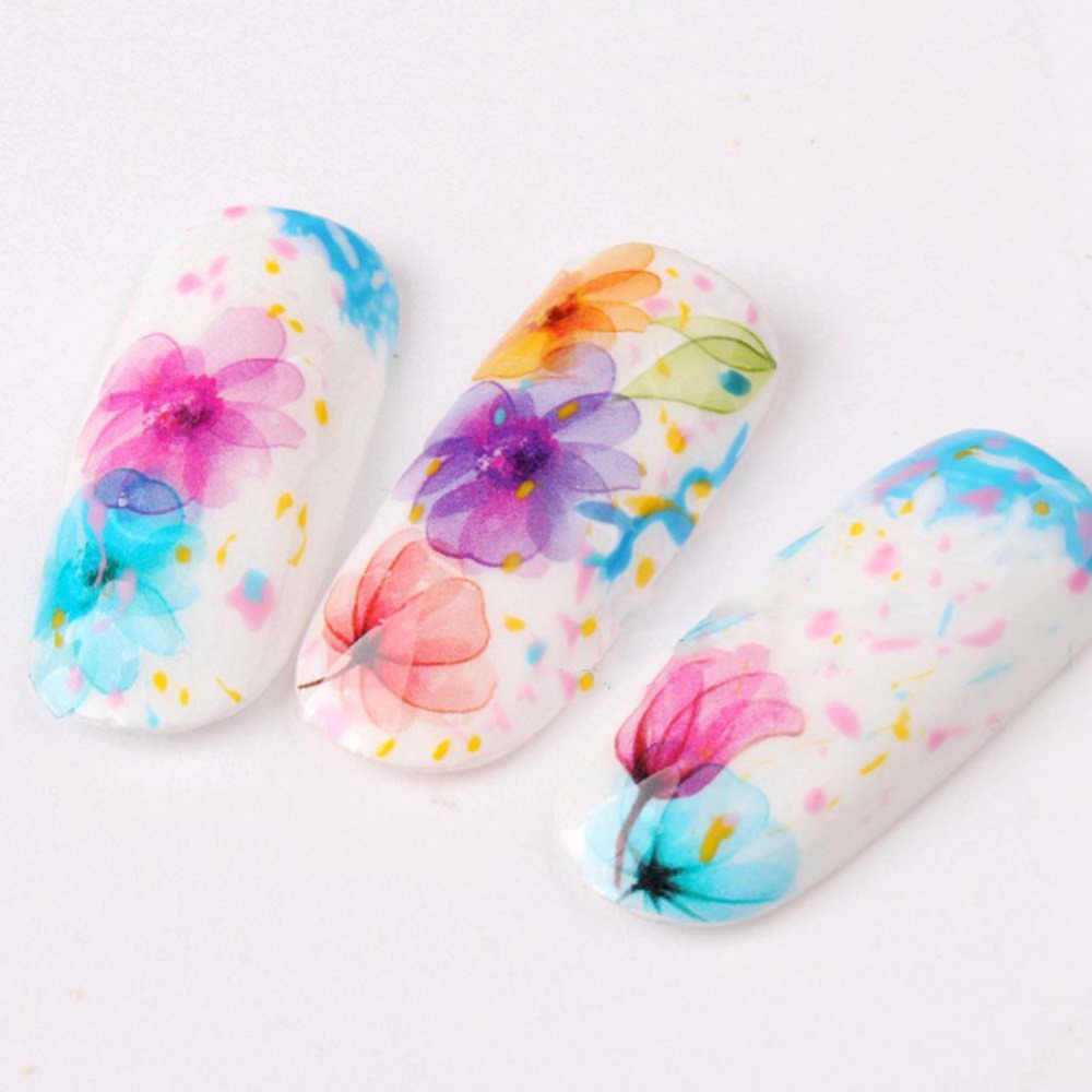 Уже многие годы цветочный рисунок – едва ли не самый популярный вид дизайна для ногтей. Его используют в качестве украшения френча, однотонного покрытия и многих других вариантов оформления. Поэтому не удивительно, что цветы все чаще наносят в акварельной технике. Это позволяет смешивать оттенки в желанных пропорциях, чтобы добиться подходящих тонов. Примечательно, что данная техника не предполагает многослойного нанесения красок. Поскольку главное – тщательно их наносить, не допуская проплешин.
