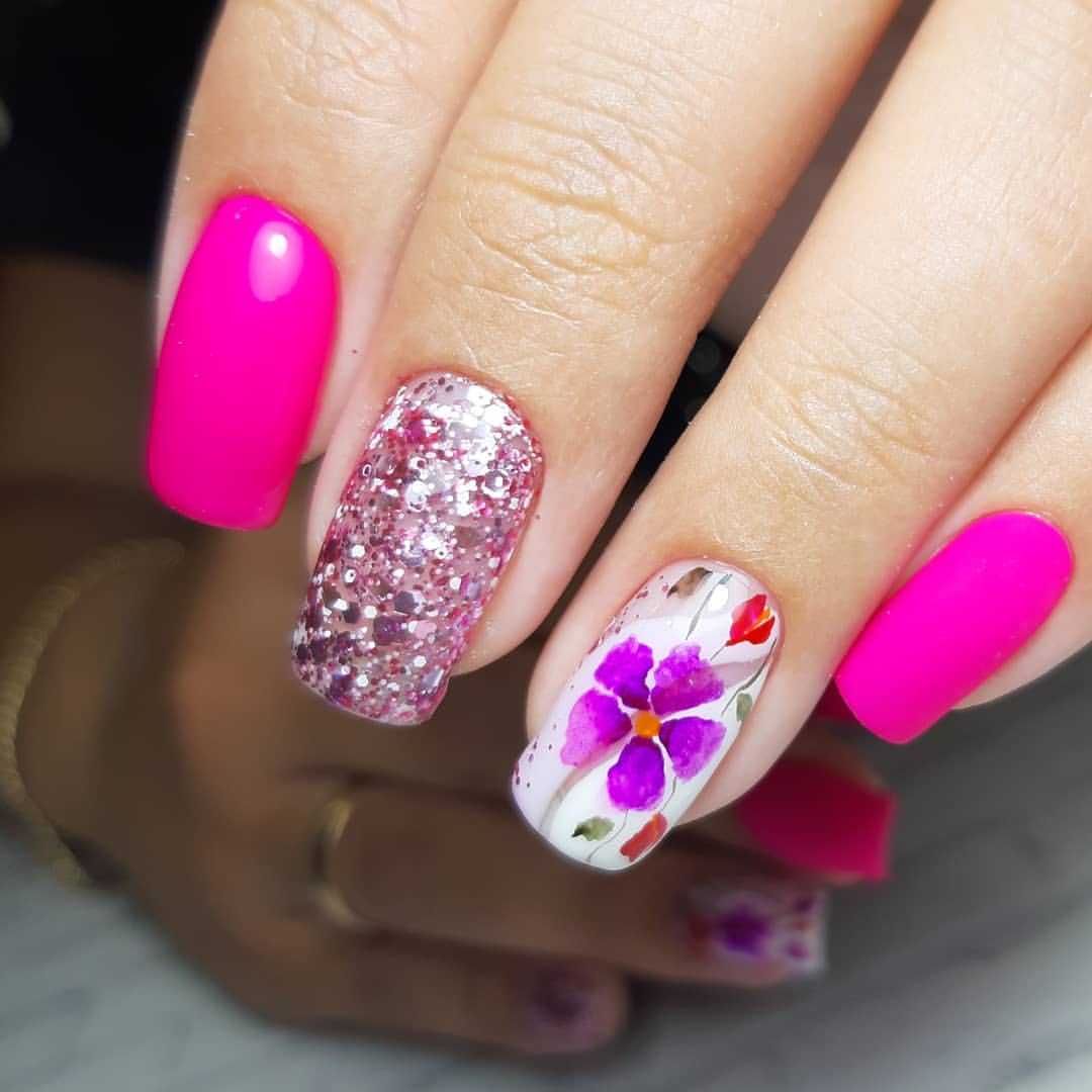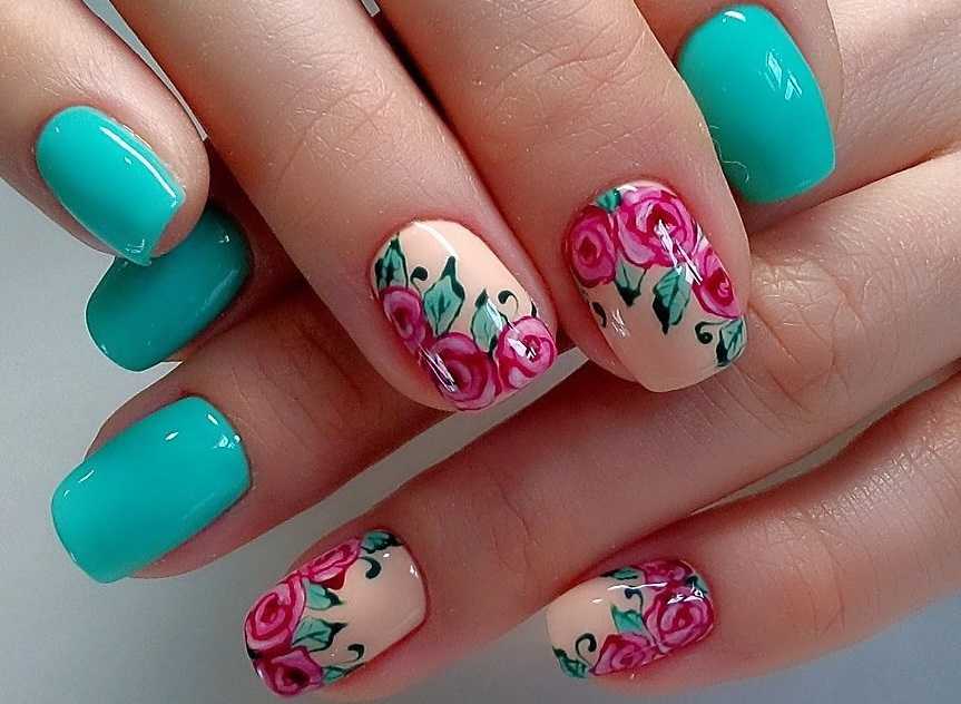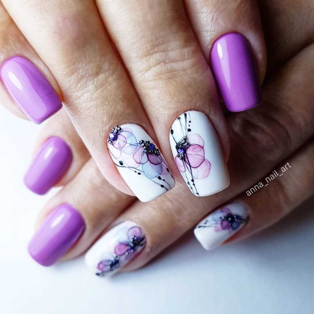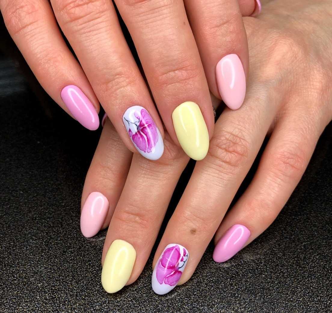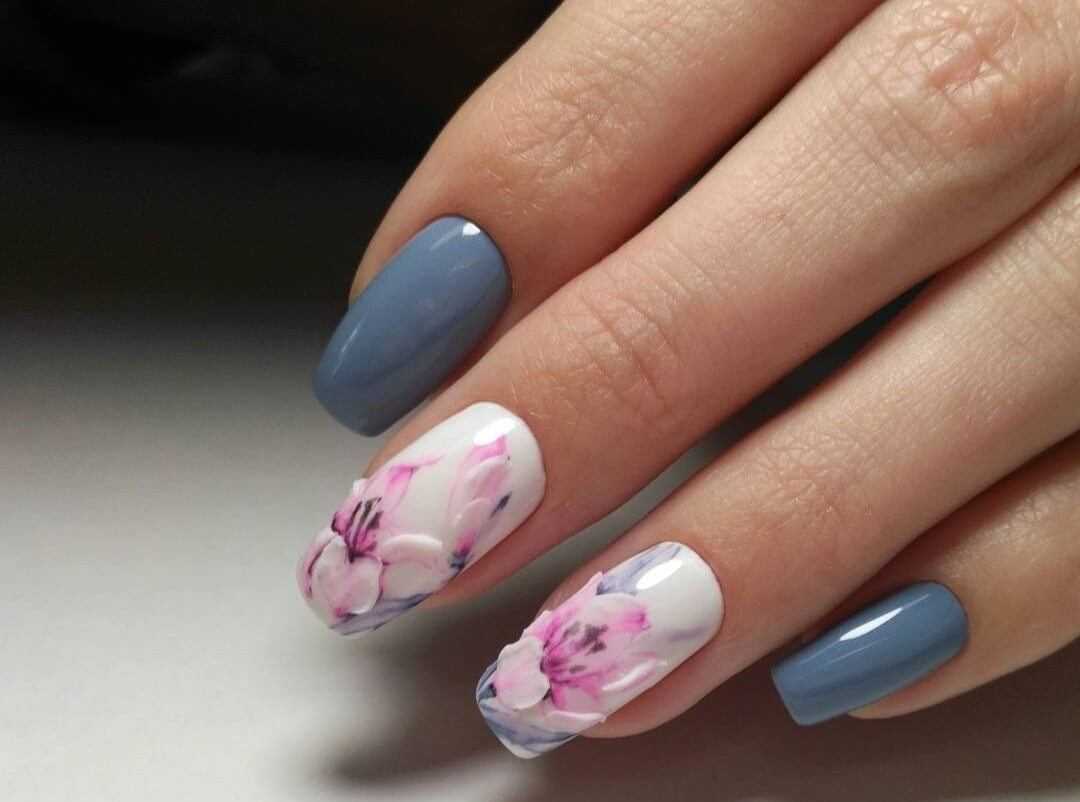 Уже многие годы цветочный рисунок – едва ли не самый популярный вид дизайна для ногтей. Его используют в качестве украшения френча, однотонного покрытия и многих других вариантов оформления. Поэтому не удивительно, что цветы все чаще наносят в акварельной технике. Это позволяет смешивать оттенки в желанных пропорциях, чтобы добиться подходящих тонов. Примечательно, что данная техника не предполагает многослойного нанесения красок. Поскольку главное – тщательно их наносить, не допуская проплешин.