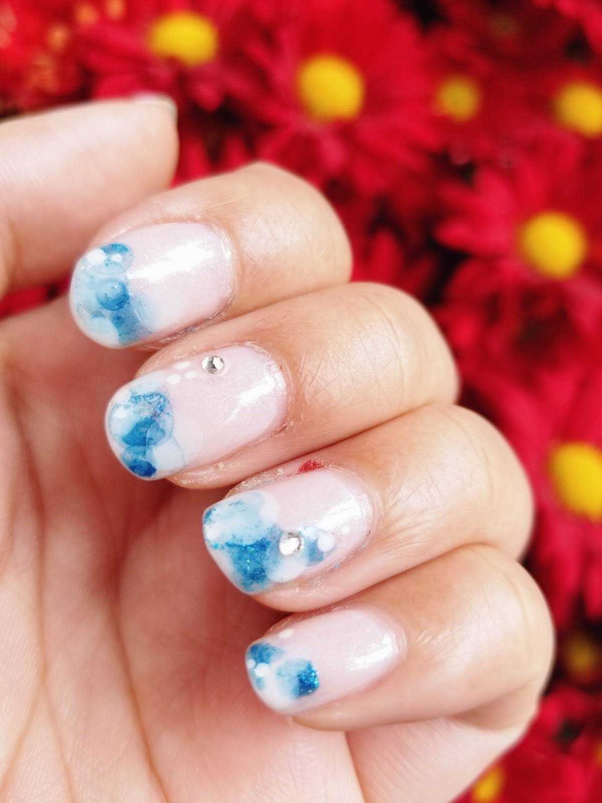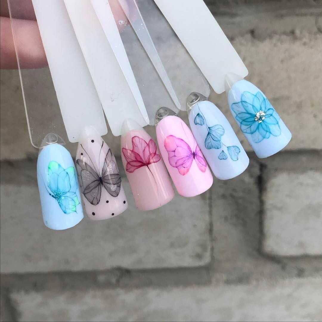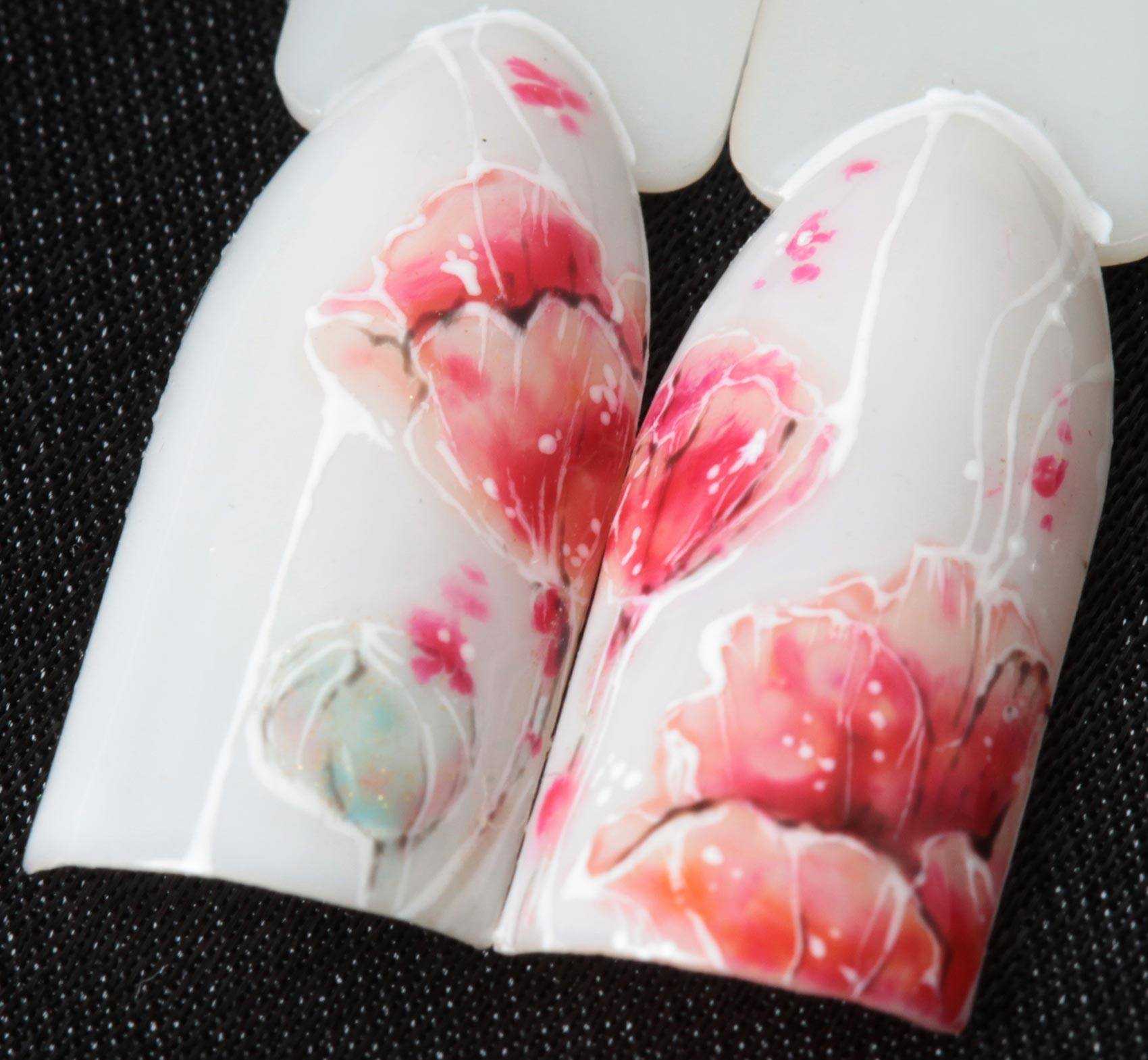 Когда все необходимое уже есть в наличии, можно приступать к нанесению дизайна. Процесс не сложный, но требует внимательности. Добиться полупрозрачности можно с помощью небольшого количества воды. Делать это стоит на специальной подложке для смешивания оттенков. После чего аккуратно, легкими движениями нанесите необходимое количество цвета на ноготок. Чтобы создать легкую вуаль за пределами рисунка, очень сильно разбавьте краску водой. Благодаря этому оформление будет смотреться совершенно по-другому, еще более нежно.
