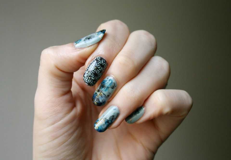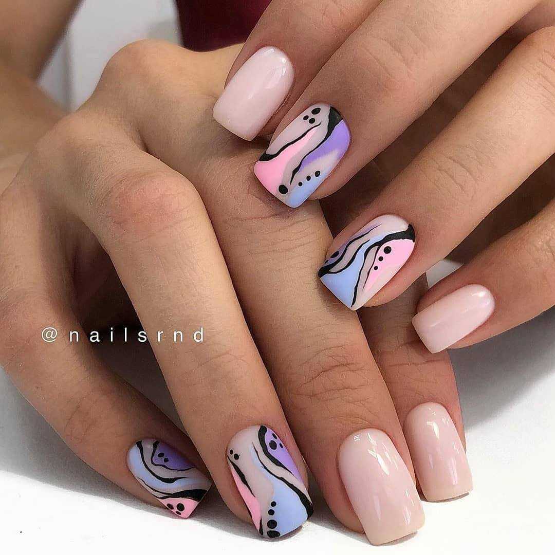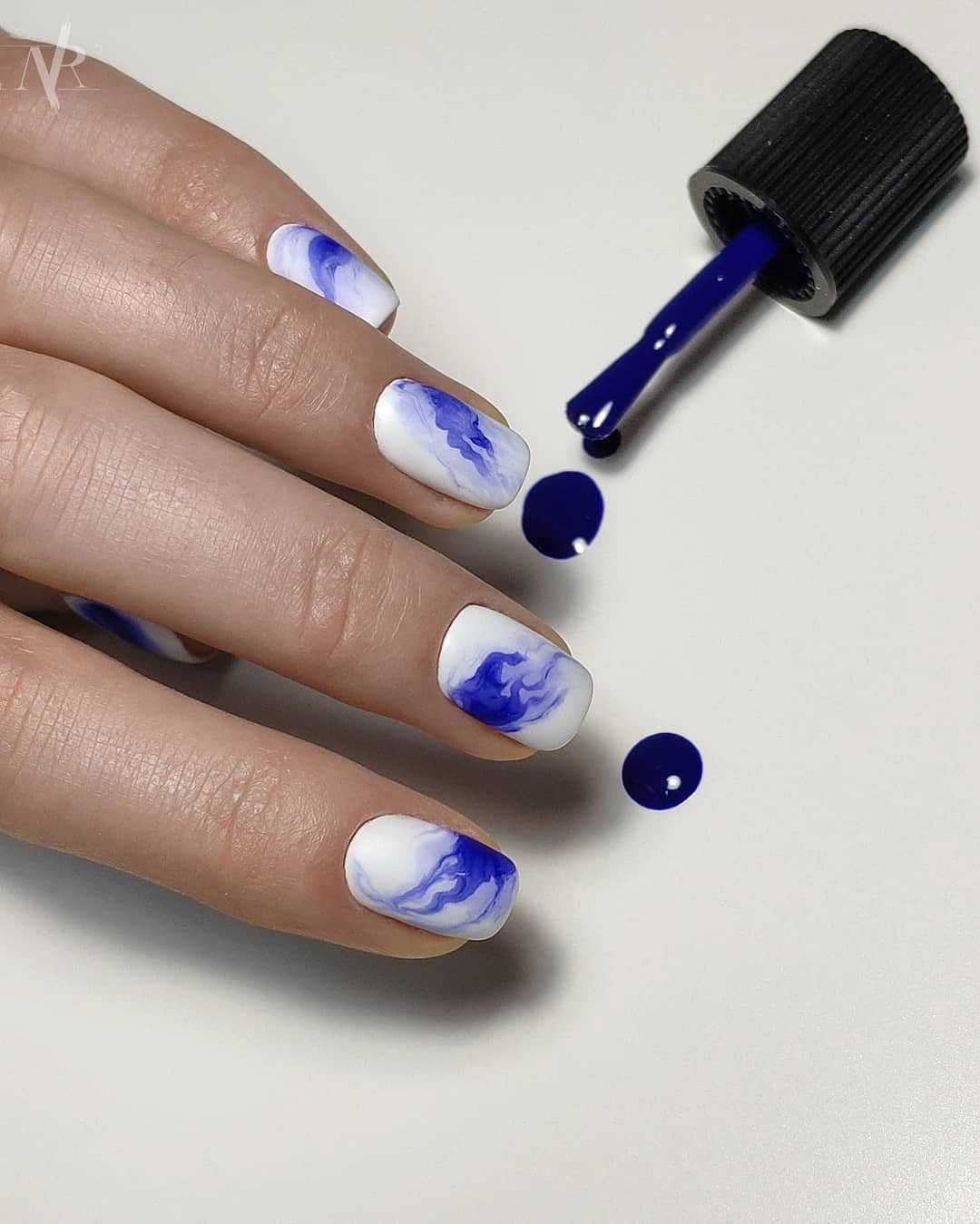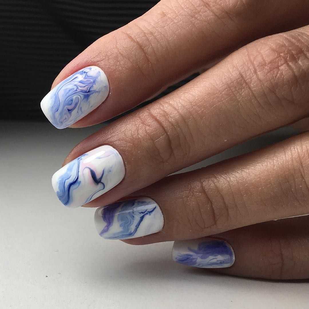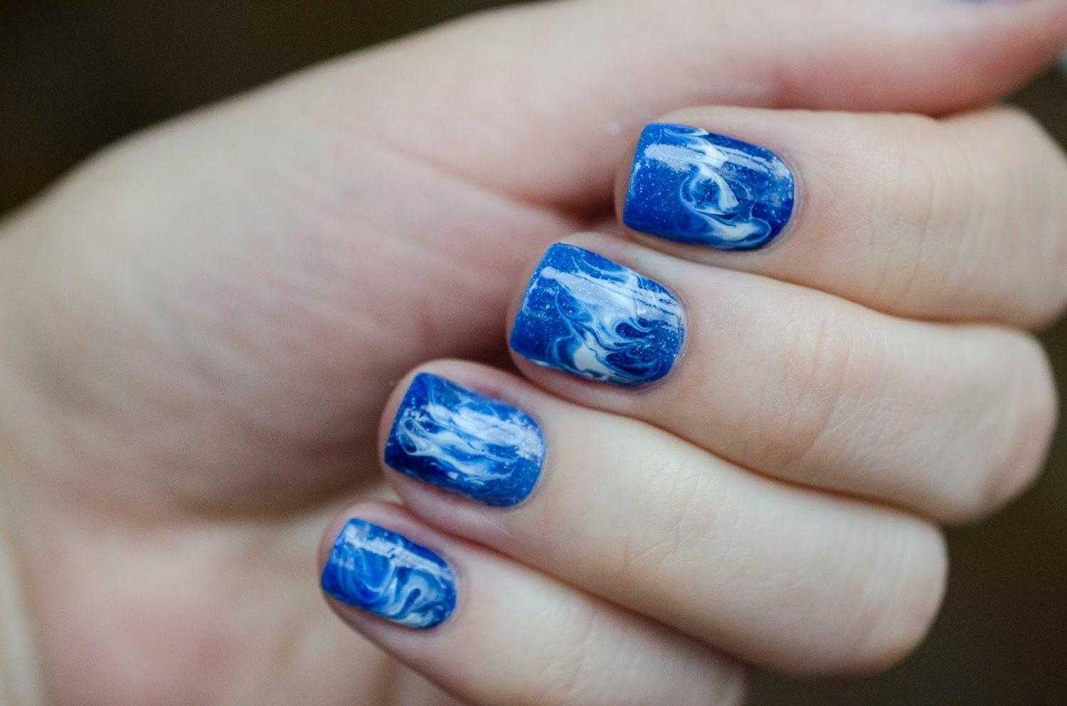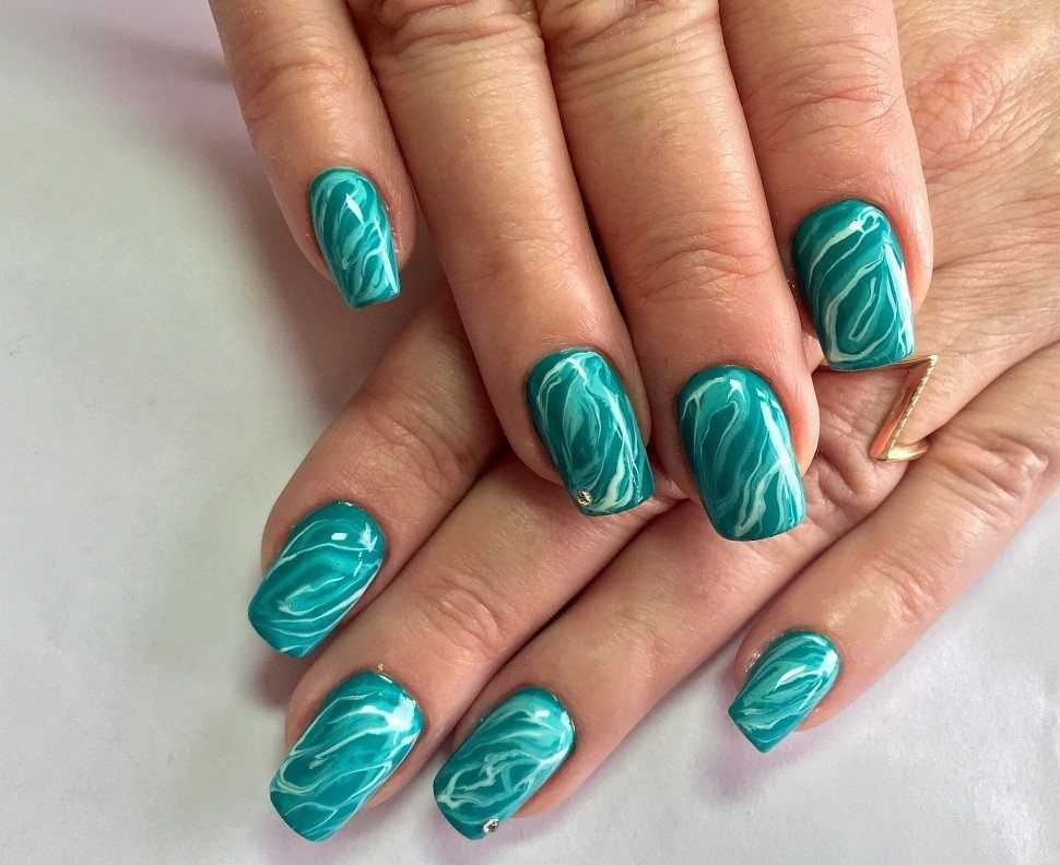 Чтобы сделать волны на ногтях разводами, нужно нанести несколько капель лака на ногтевую пластину. Затем нужно взять специальную палочку и выполнить движения по волнообразной траектории. Чтобы лак хорошо держался, нужно нанести закрепляющий слой. Украсить такой дизайн маникюра можно стразами или другим декором.
