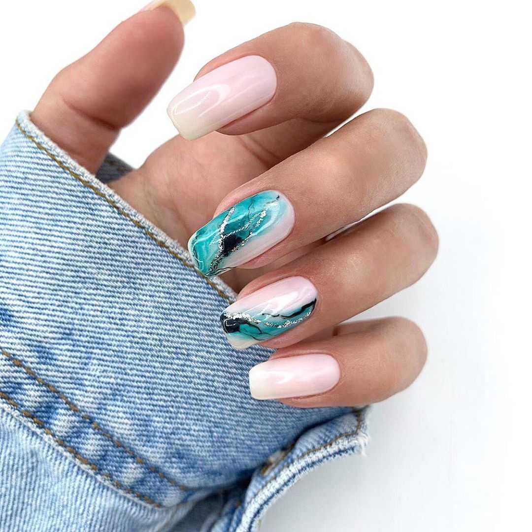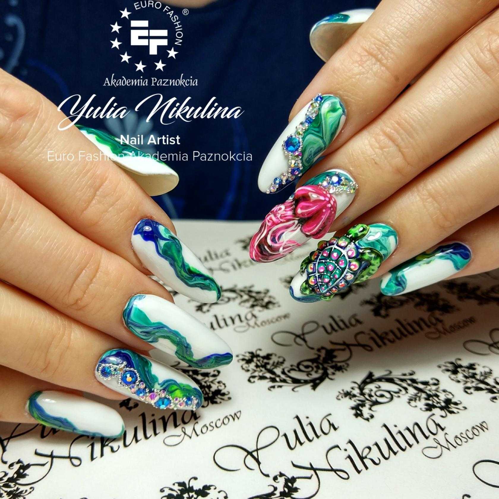 Для того что б сделать аквариумный маникюр на ногтях нужно помнить, что не стоит выбирать слишком объемные дизайны и крашения.