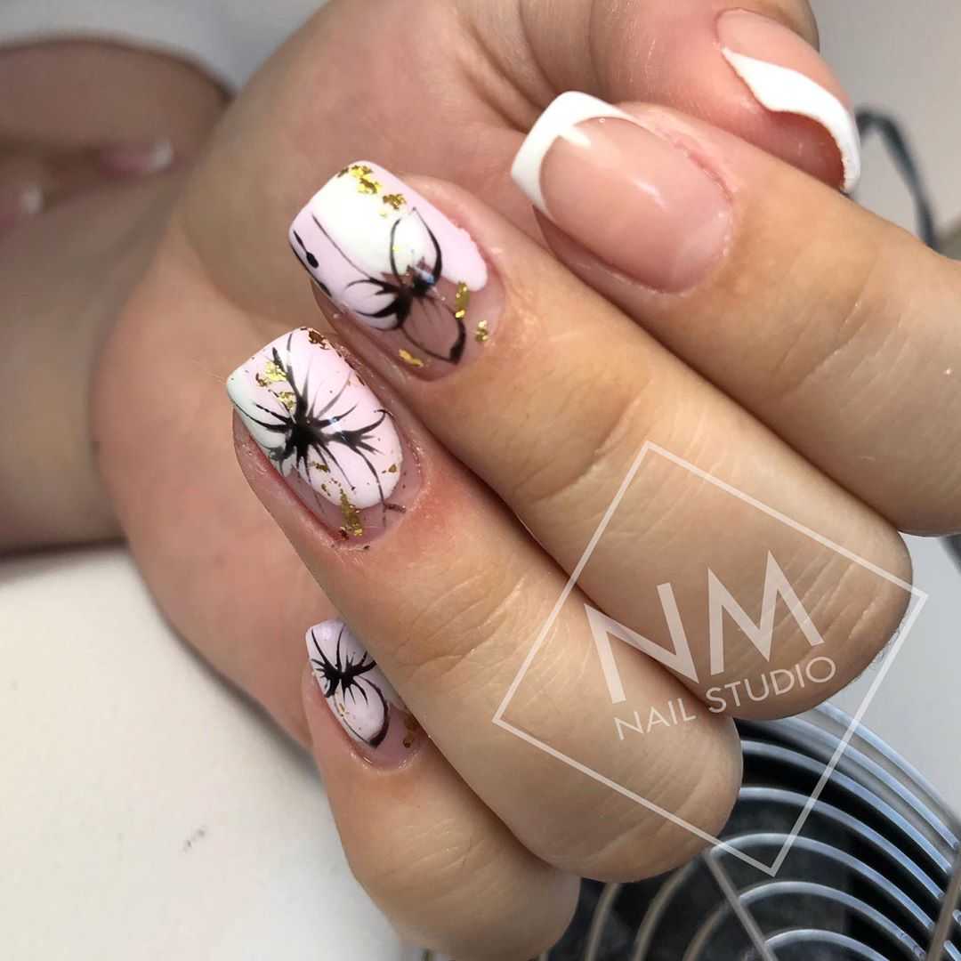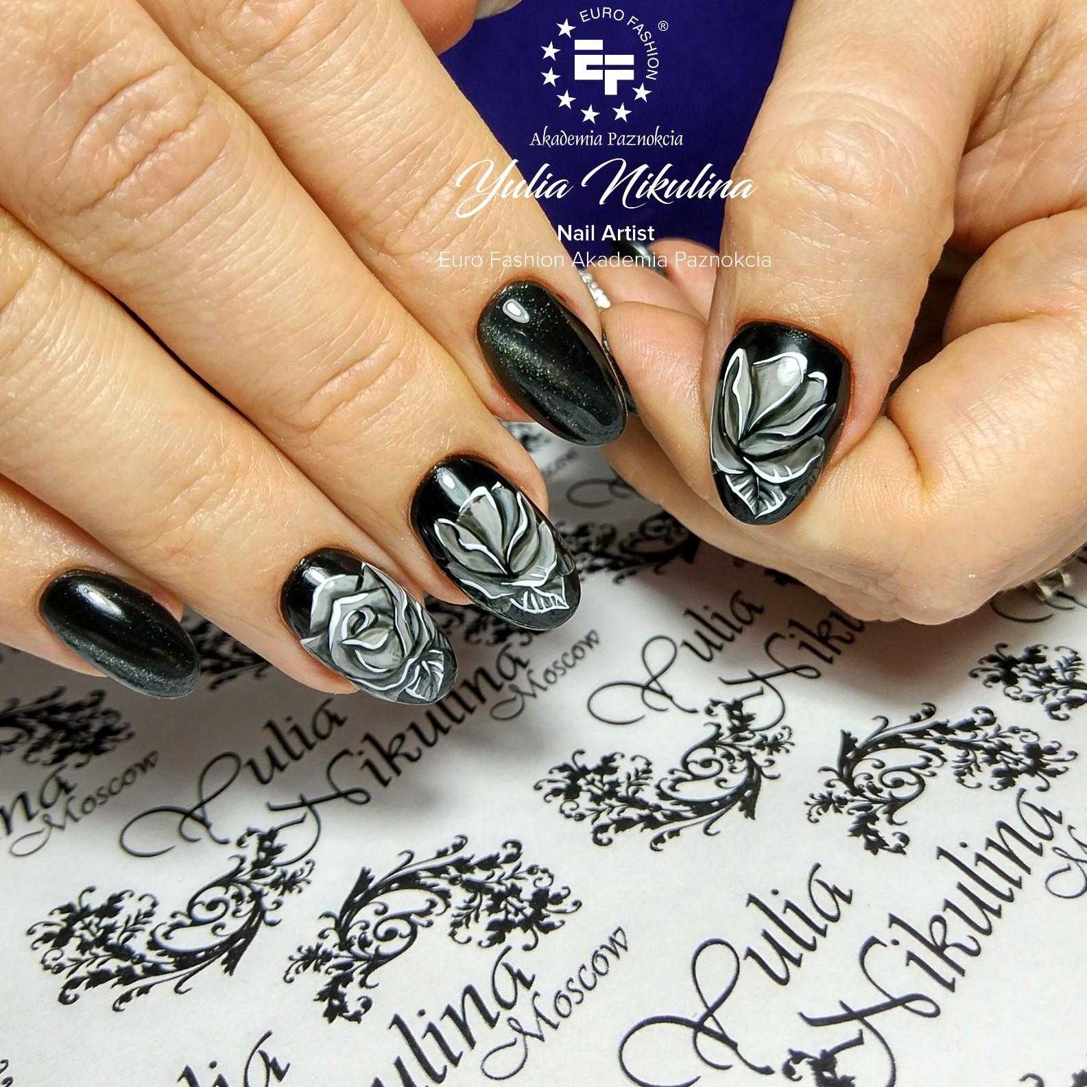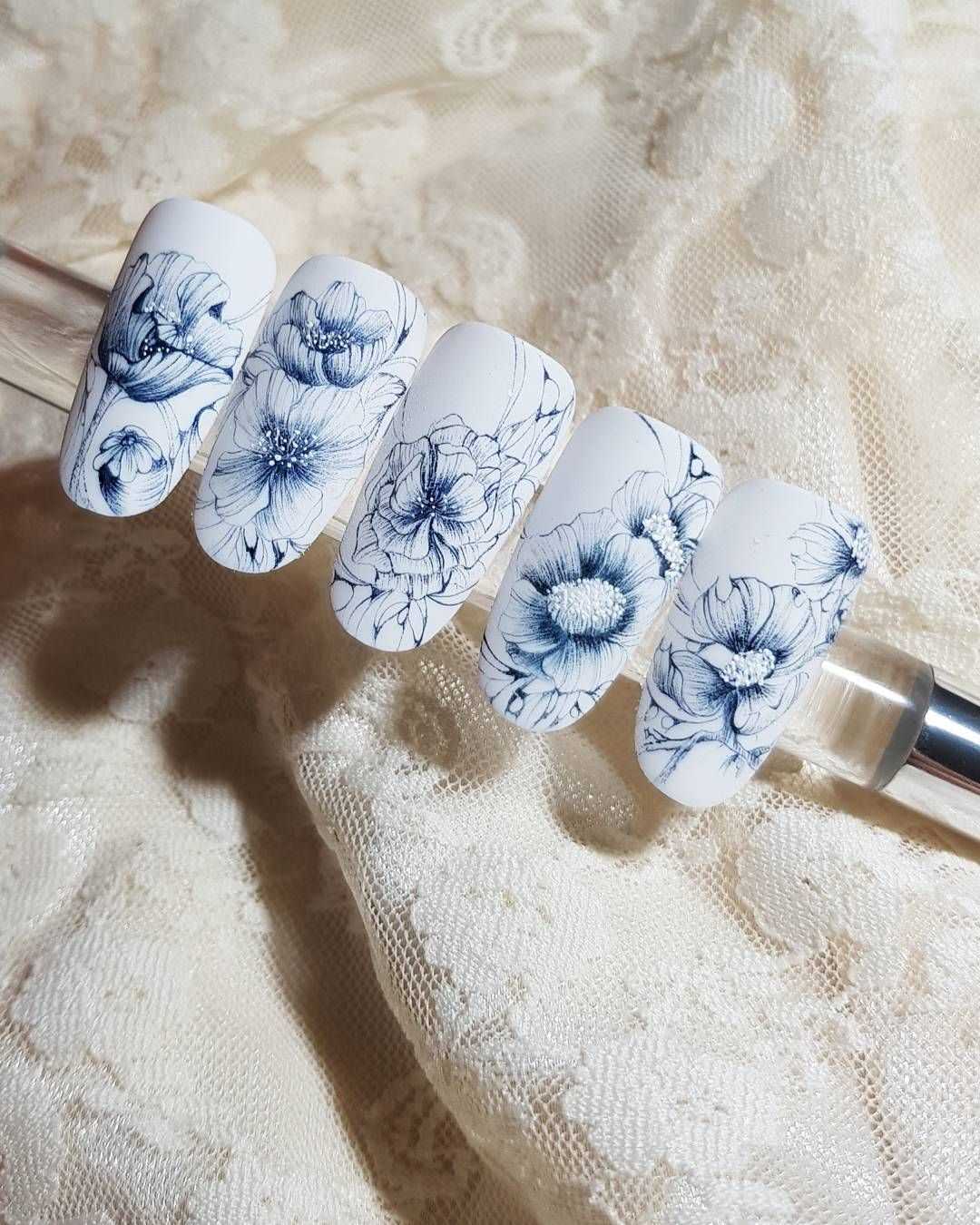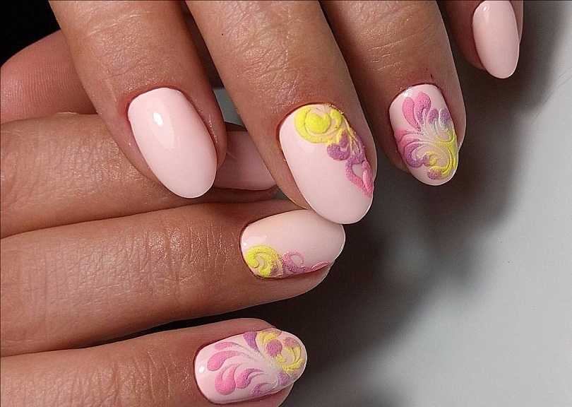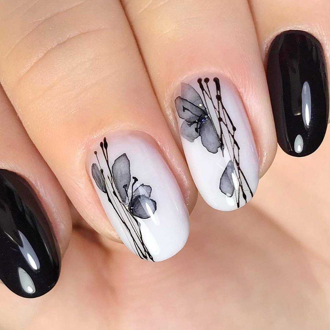Основа под рисунок берется преимущественно белого цвета, но могут быть и другие: нюдовый, бледно-розовый, бледно-голубой, нежно-сиреневый. Кроме пастельных оттенков сегодня нейл-мастера предлагают даже рисунок на черном гель-лаке, выполненный белыми и светлыми красками. Но такой дизайн предполагает монохромную или дихромную (два цвета) роспись.