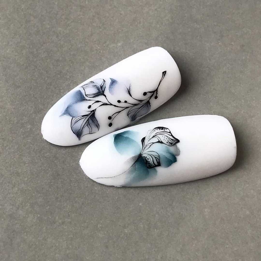 Также эффект воздушности достигается благодаря мягким градиентным переходам цвета. Данный вид дизайна не ограничен никакими рамками. Любой желаемый рисунок может быть выполнен в технике акварельной разрисовки. Такой интересный прием имеет способность превращать любые ногти в настоящие произведения искусства.