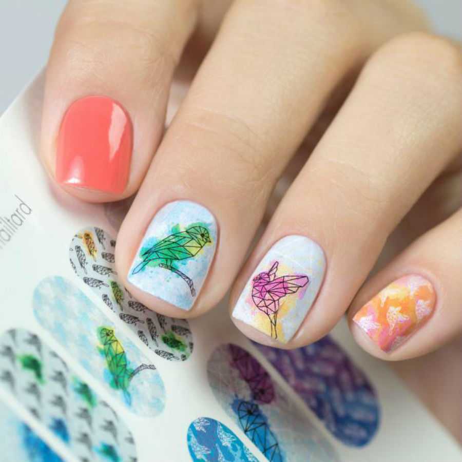Если данная техника нанесения кажется вам слишком сложной, существуют и альтернативные решения. В первую очередь речь идет о готовых картинках, которые представлены, как слайдер-дизайн или наклейки. Благодаря им можно нанести дизайн симметрично или же выбрать определенную его часть. Кроме того, наклейки часто используют для оформления лунного маникюра в акварельной технике. Буквально несколько страз или блесток и оформление будет выглядеть невероятно красиво.