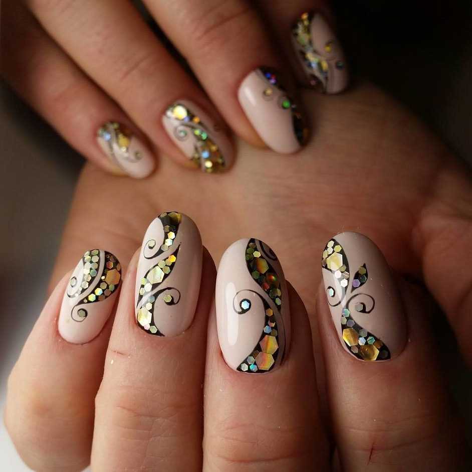 - Шик с нюдовым оттенком – основа в стиле лоск заменяется на нюд, декор проводится конфетти любого оттенка.