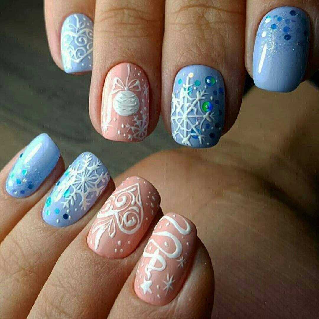 Для придания образу новогоднего настроения специалисты рекомендуют оформлять ноготки снежинками, елочками, новогодними игрушками и другой символикой Нового года.