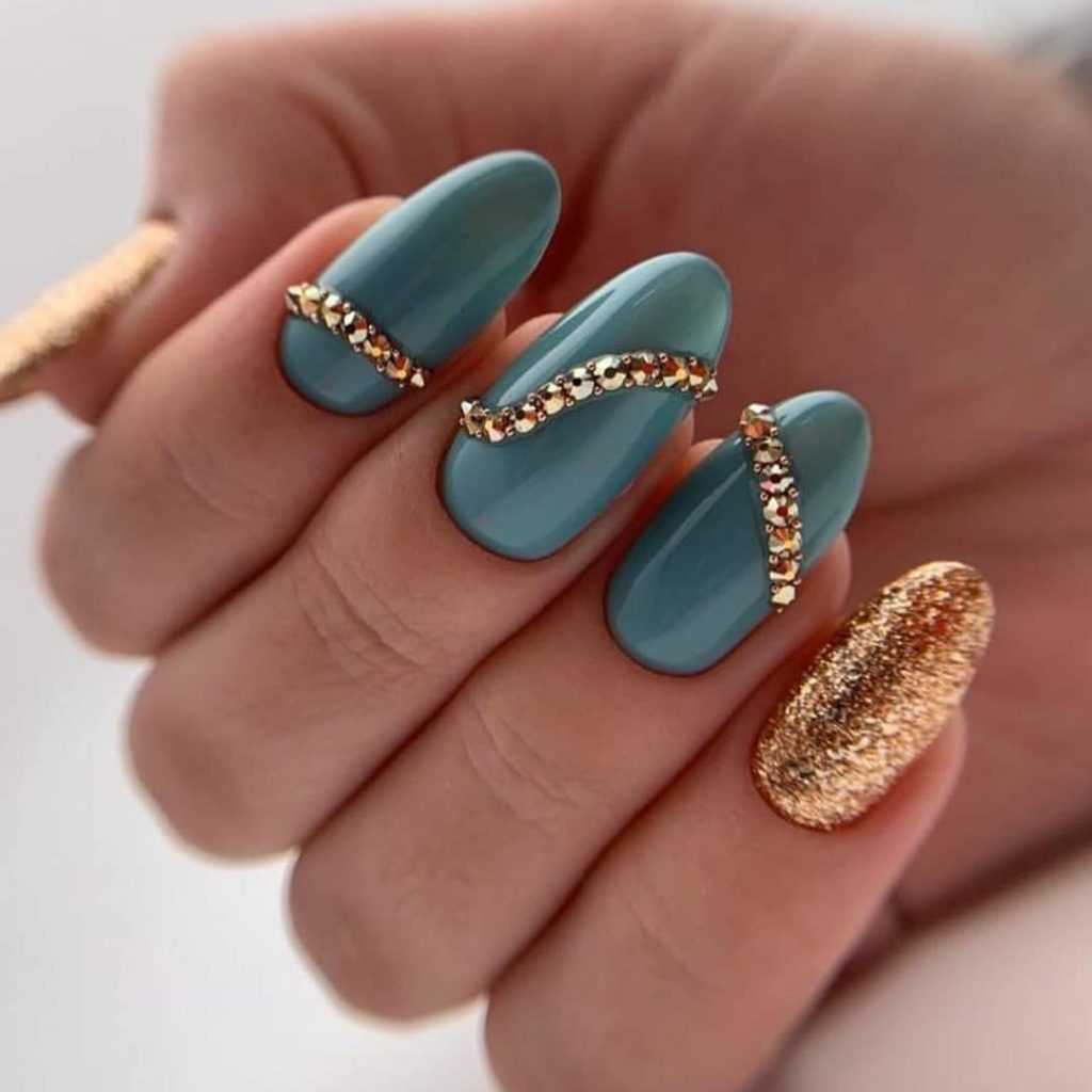 В новом 2022 на праздник выбирайте золото, чтобы быть в центре внимания. Воплотите фантазии, используя зеркальную втирку для покрытия двух, трёх ноготков. Покройте ноготки тёмным гель-лаком с матовым топом и украсьте их золотыми кристаллами либо блёстками.