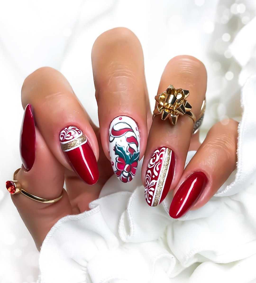 В тренде все оттенки красного: бордо, винный, алый и др. Традиционное зимнее сочетание красного и белого цветов снова будет в моде. В качестве декора при этом используют шведский орнамент, имитацию вязания. Но самые эффектные мотивы для новогоднего маникюра в этих тонах — снежинки, елочные игрушки, снеговики, подарки и пр.