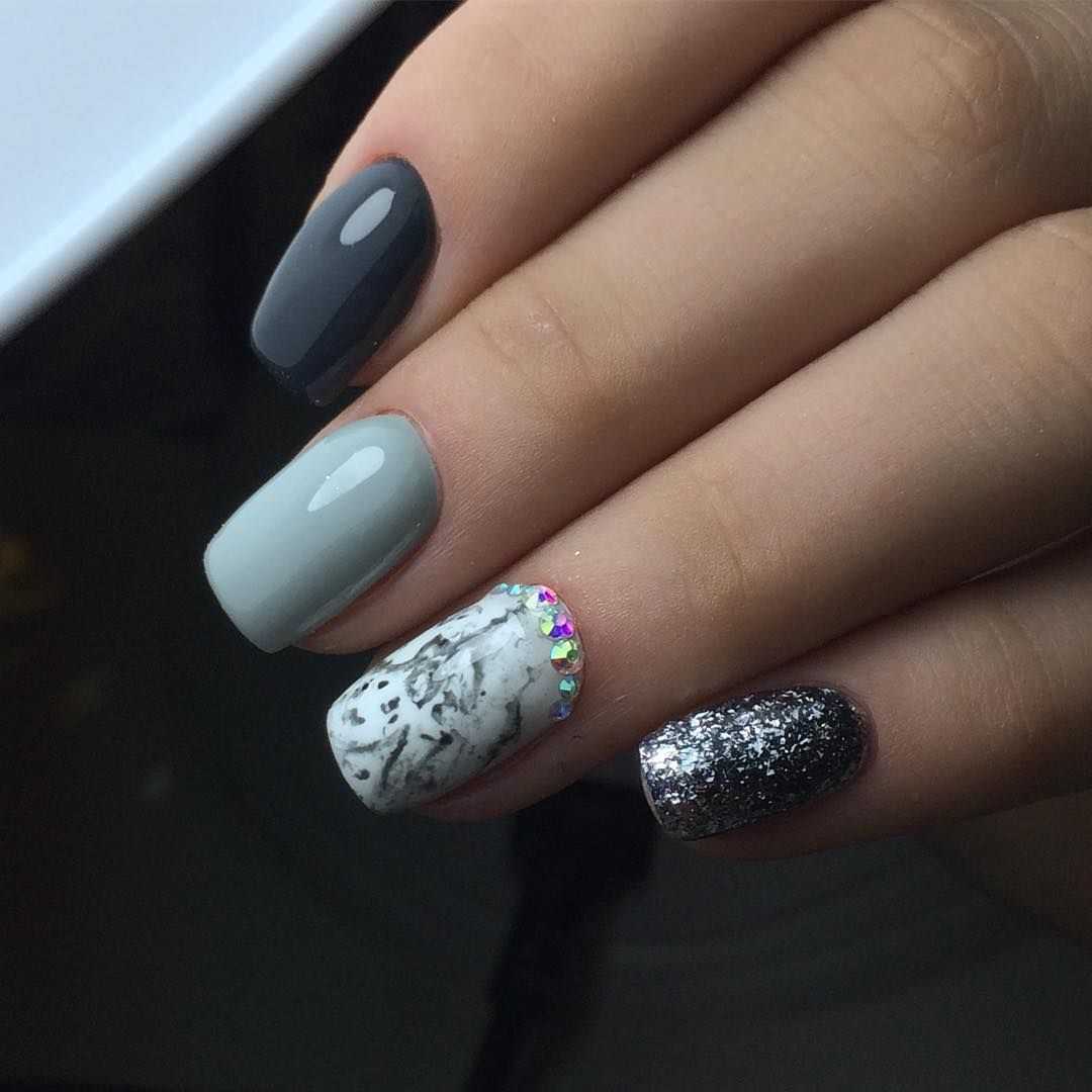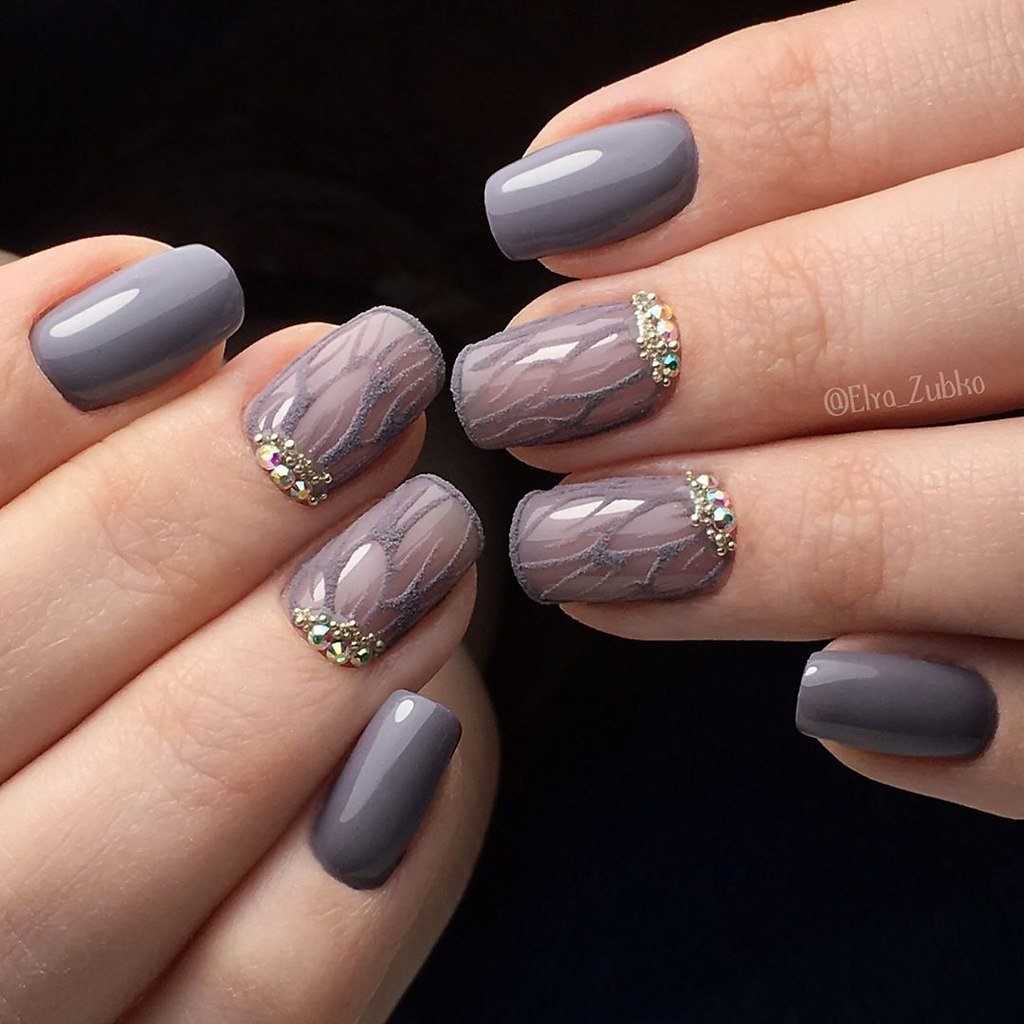- На серой основе можно создать оригинальный мраморный узор или украсить ноготки стразами.