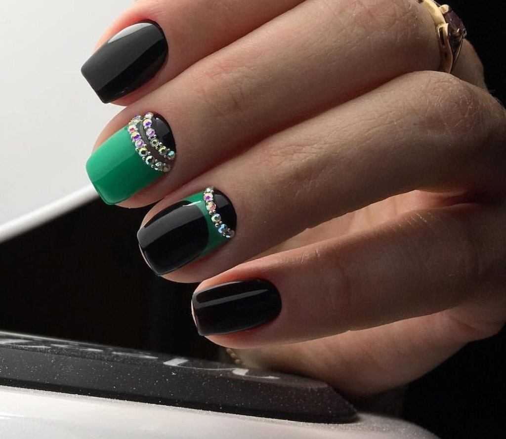 Вместе с зеленым лаком стильно выглядят черные, синие, желтые цвета и их оттенки. Их можно украсить небольшим количеством блестков или стразов.