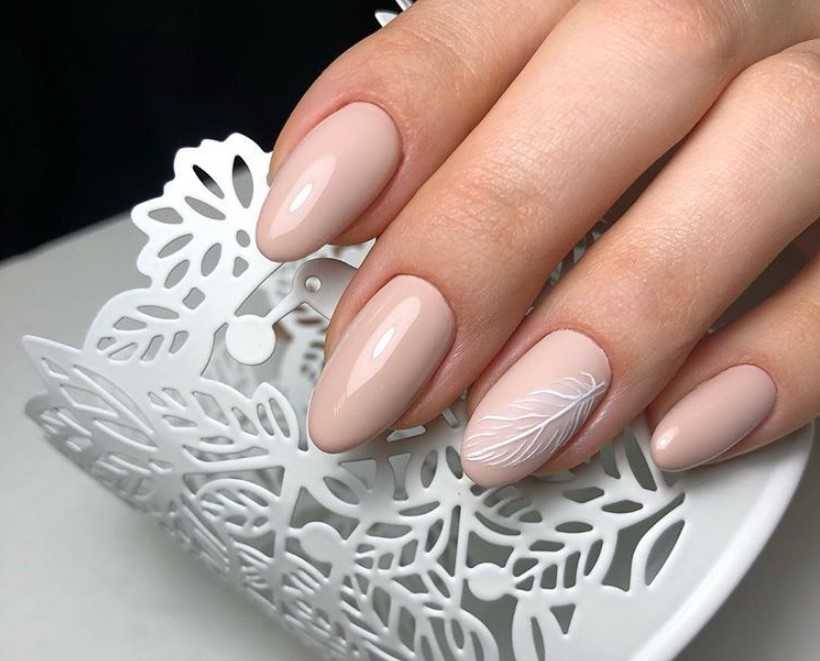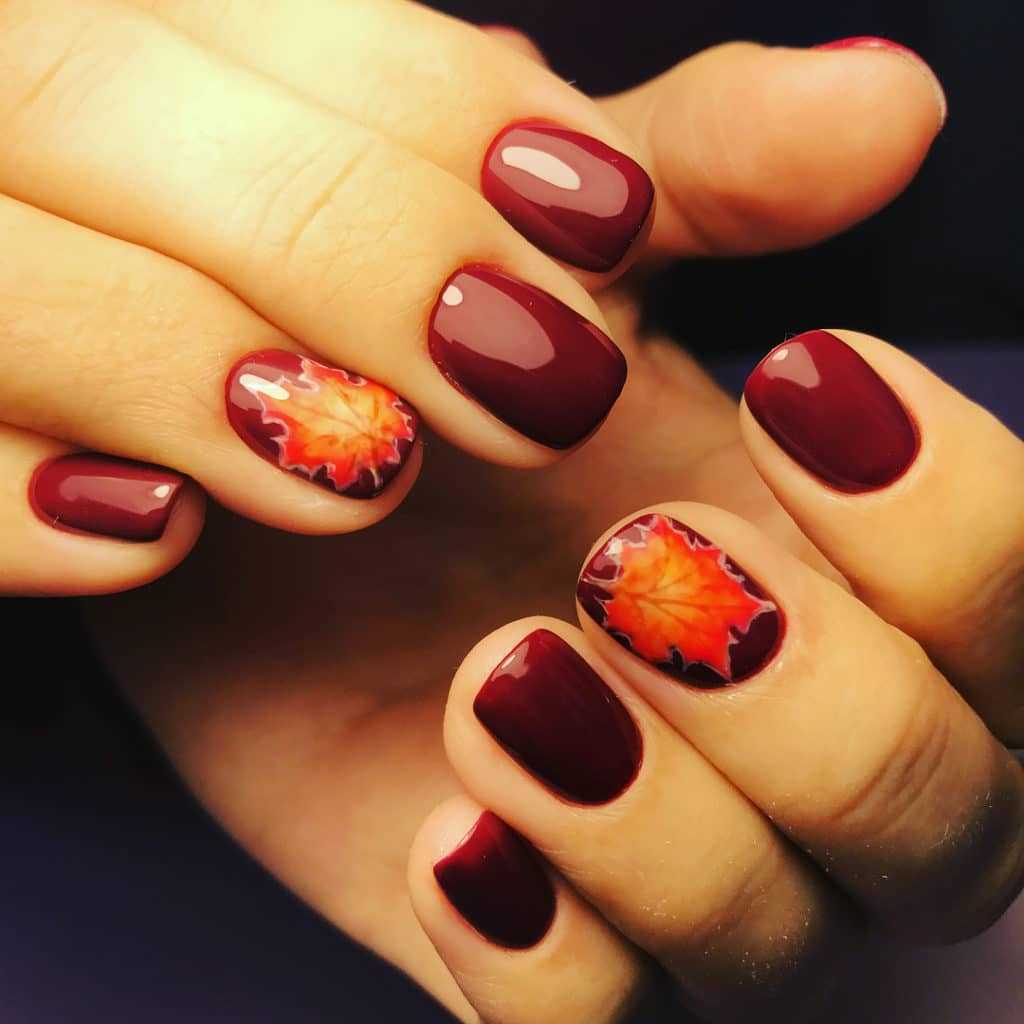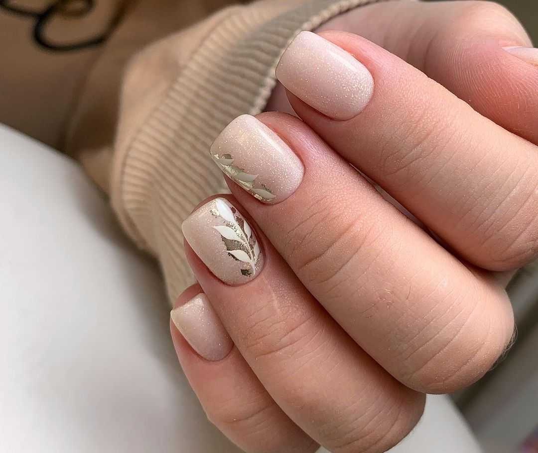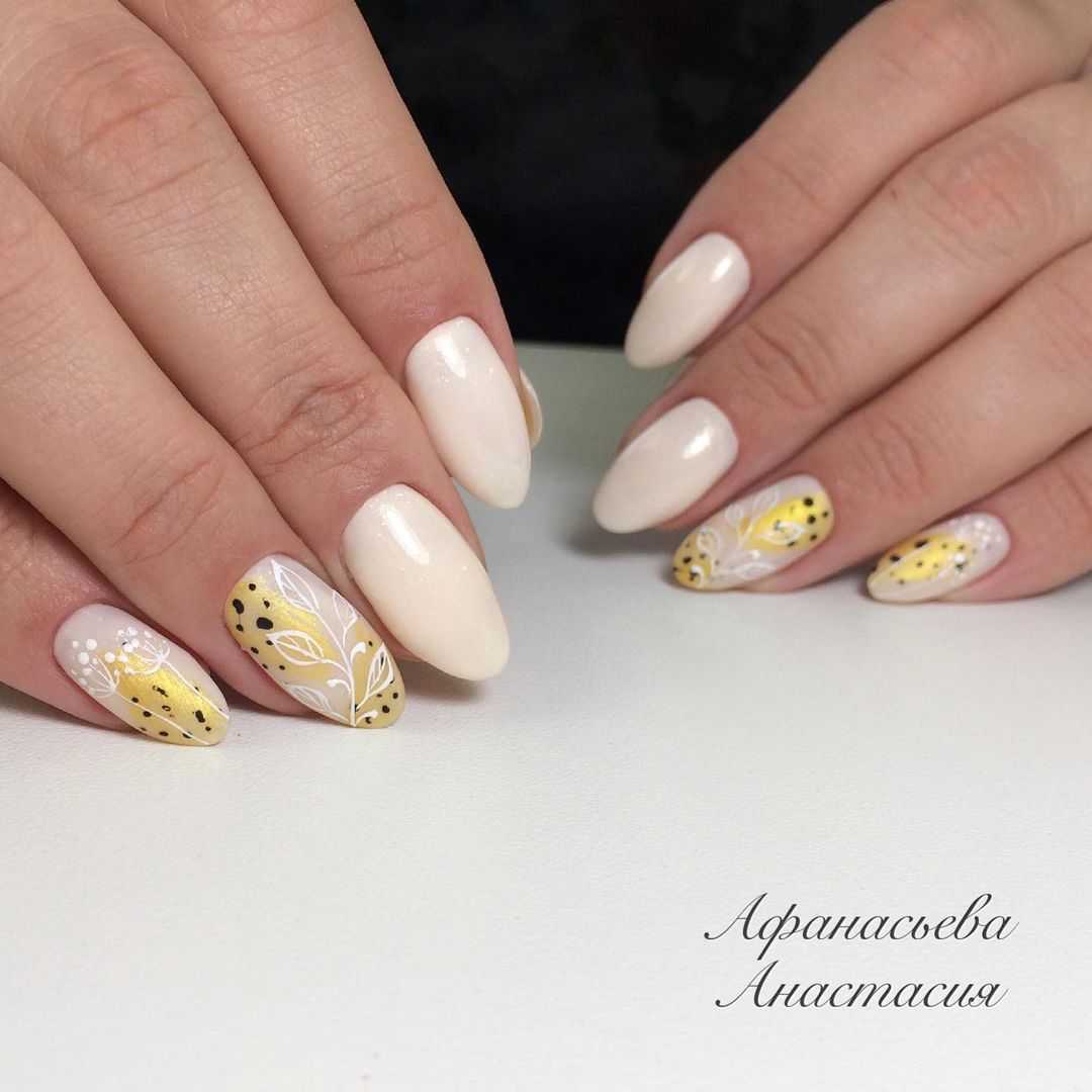Отличным выбором для колоритного осеннего дизайна маникюра с листьями будет молочный фон. Нейтральный оттенок лака позволит проявить весь креатив сполна. Молочный оттенок лака передаст контрастность выбранных вами оттенков, добавит идеальную цветовую коррекцию и в целом сделает маникюр максимально выразительным. Чтобы маникюр приобрел праздничный внешний вид, дополните дизайн с осенними листами красочной фольгой или же добавьте несколько золотых бликов с помощью тонкой кости для рисования.