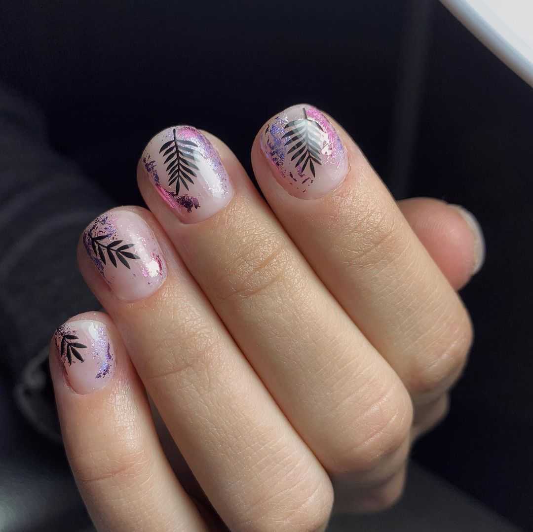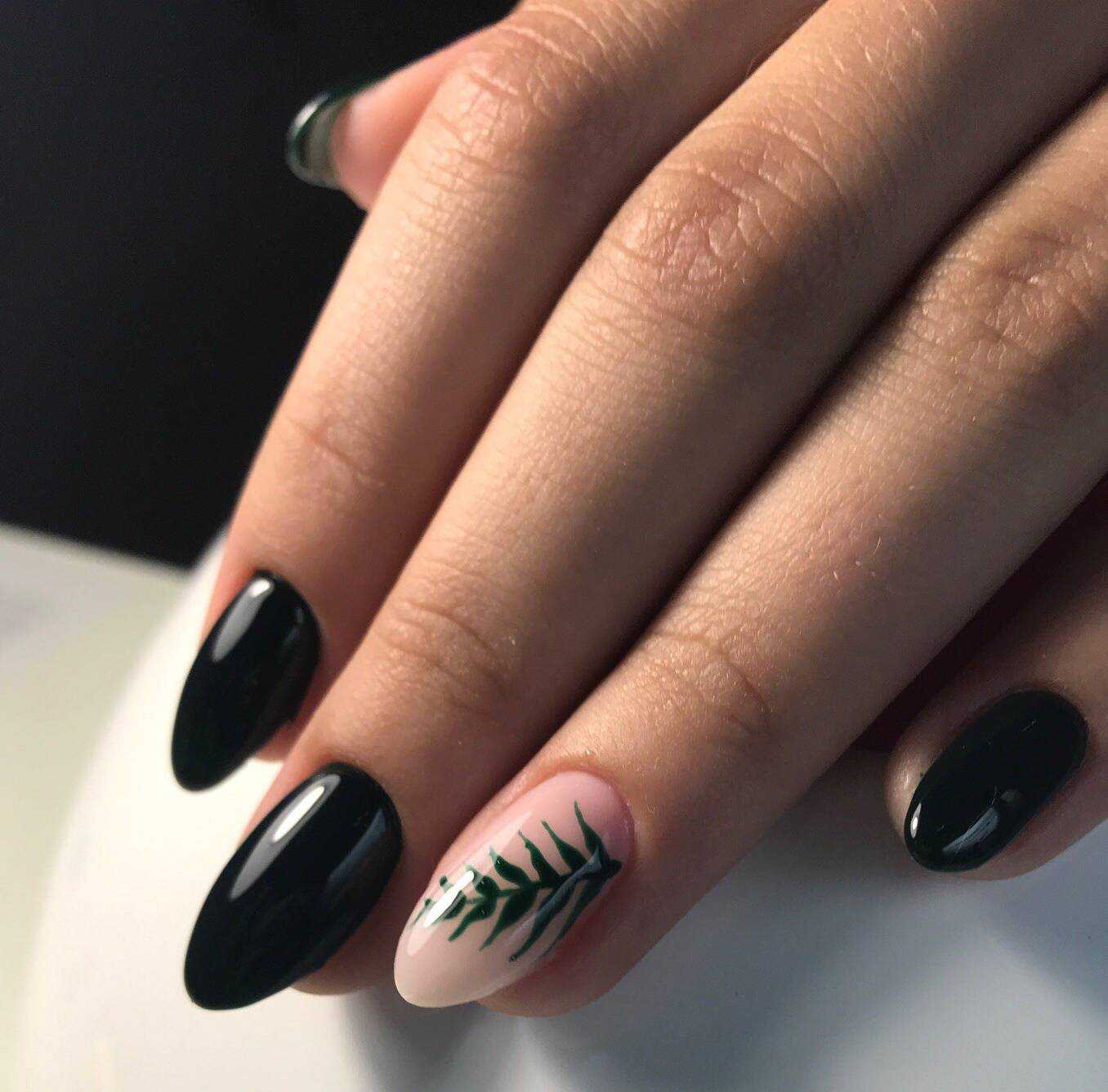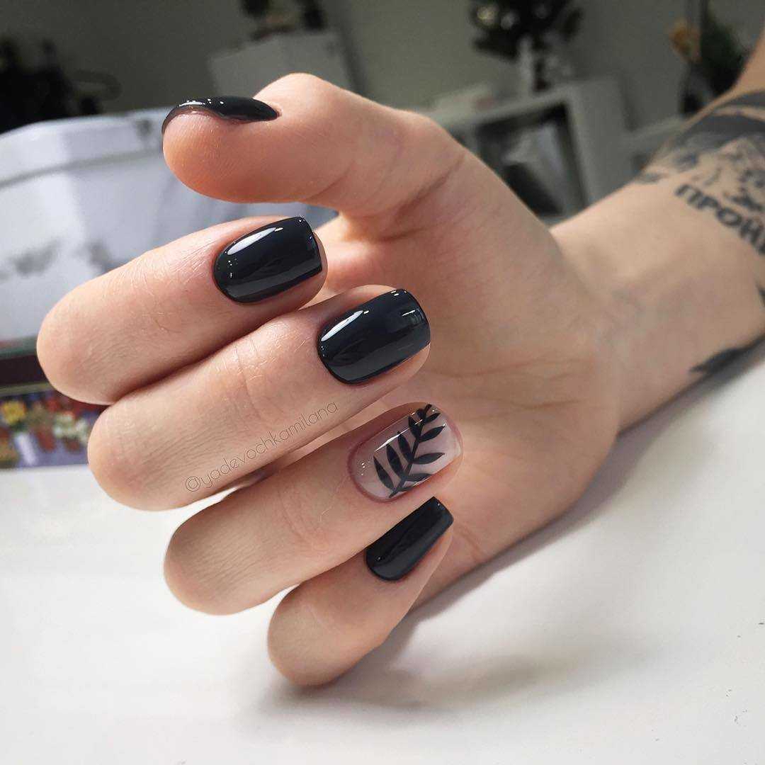 Черный маникюр с листьями