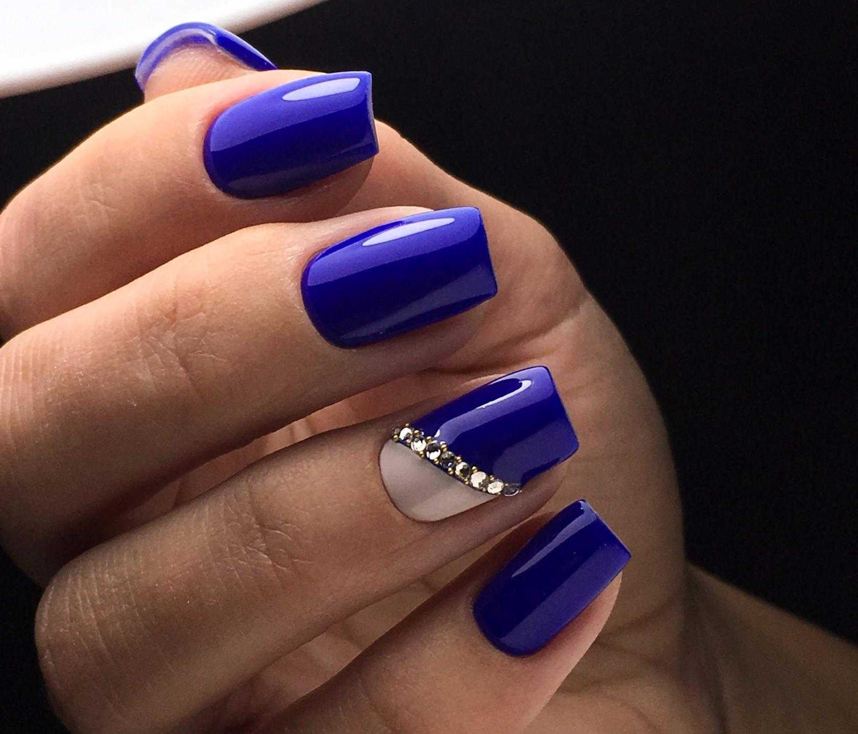 Белый лак хоть и отличается капризностью в уходе, но априори выглядит свежо и стильно. На таком фоне рисунки в сине-голубой гамме выглядят особенно контрастно и красиво. В данный маникюр можно смело включать золотистые или серебристые акценты – подобные детали соответствуют ключевым модным тенденциям сезона.