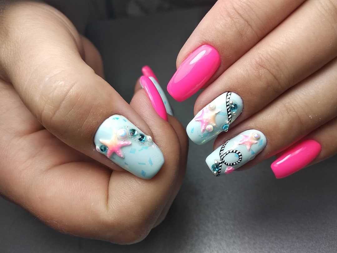 Отдых, море, лето — это идеальное время для экспериментов. Это период для использования в морском маникюре ярких и насыщенных цветов. Чтобы получить яркий и запоминающийся маникюр для отдыха, можно использовать технику растяжки цветов от пальца к пальцу, при этом получив в итоге эффектный маникюр с разными неоновыми цветами. Когда вам ваш мастер маникюра предлагает яркий маникюр, в воображении сразу вырисовываются кислотные оттенки лака. При этом многие забывают, что для создания яркого дизайна — самое главное не только цвет, но при этом еще и техника выполнения дизайна, а именно: