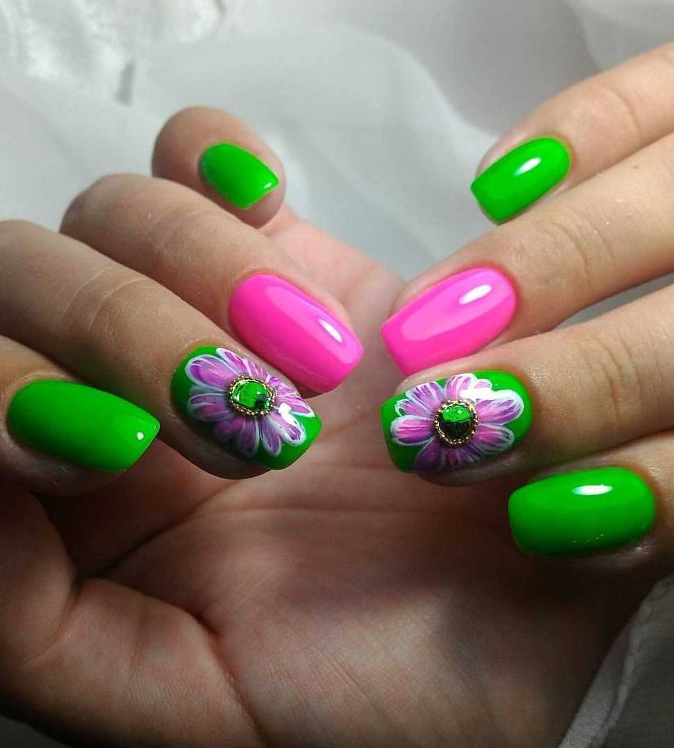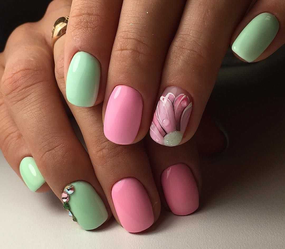 Розовый и зеленый будут смотреться в двух сочетаниях: когда оба тона яркие и когда нежные пастельные. Идеально выглядят мятный и нежно-розовый, сочный малиновый и травянистый, яркий фламинго и салатовый. Мастера могут комбинировать эти два оттенка во френче, лунном маникюре и даже градиенте.
