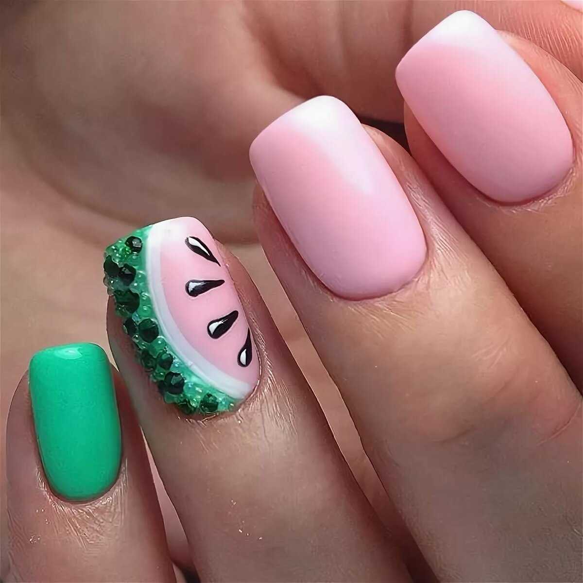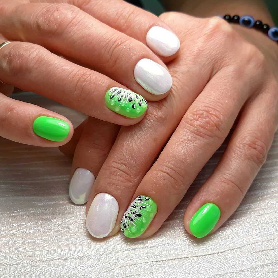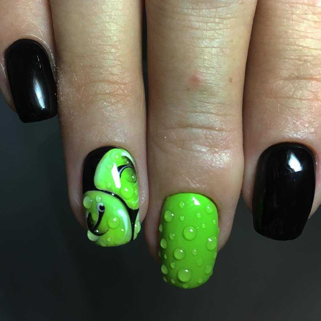• салатовый с тёмно-зелёными клейкими лентами – создание на ногтях подобной абстракции при помощи кислотной яркой основы и чётко очерченных клейких линий в насыщенном буром цвете смотрится очень броско и приметливо. Подобная красочность чаще применяема на длинные острые или квадратные ноготки, что позволяет создать с помощью лент чётко очерченный прямыми линиями френч или подобие из ромбовидной или квадратной клети на ногтях в перпендикулярном пересечении имитированных прямых;• арбузный маникюр – достаточно модное и яркое решение в виде маникюра с рисунком из арбузной кожуры пришлось по душе очень многим представительницам прекрасной половины; своим необычным, но сочным видом такой дизайн не может не вызывать интерес и любопытные взоры окружающих. Актуально выполнять подобное художество в мате и добавлять сверху такого покрытия мелкие глянцевые капли прозрачного геля, имитируя тем самым ещё большую свежесть и практически передавая запах свежевымытого арбуза;• травяной дизайн – высаженные в плотном густом покрытии травяного цвета ворсинки смотрятся на ногтях очень стильно и молодёжно. Вместе с надетым модным свитером-травкой в любом его цветовом решении такой маникюр будет смотреться ещё более акцентированно и уместно – эдакий свежескошенный газон прямо на ноготках современной модницы.