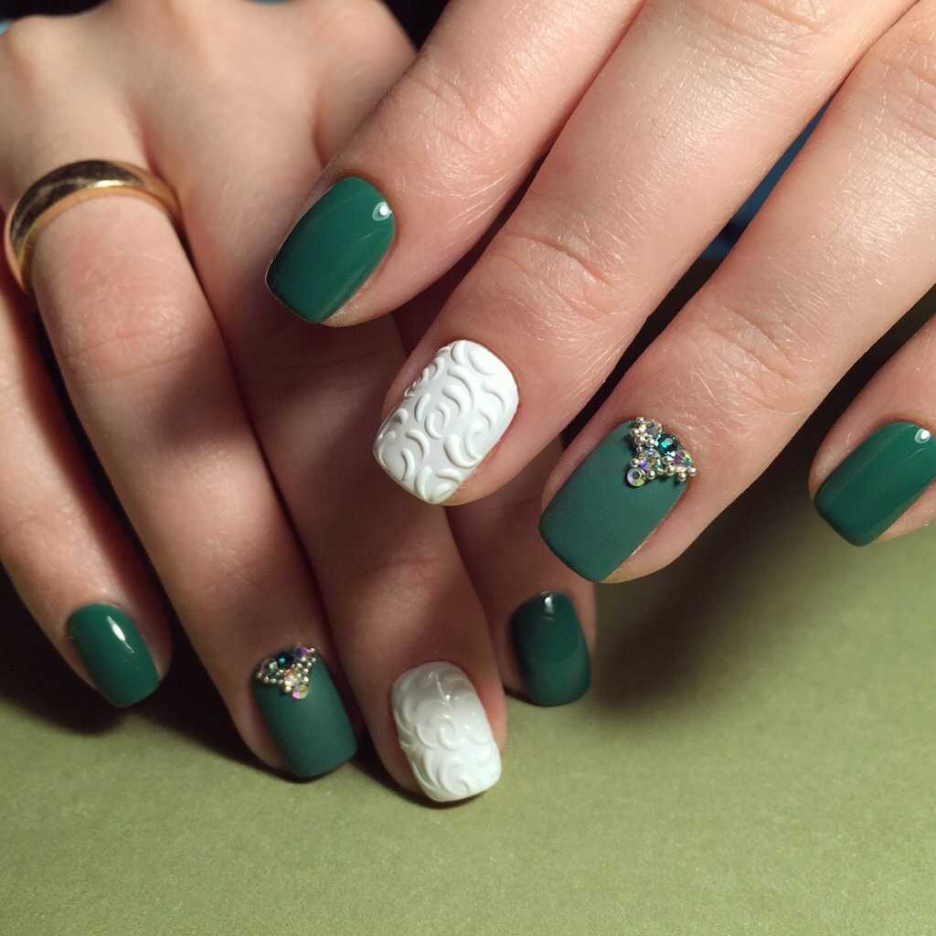 Разнообразив зеленый цвет белым в маникюре, можно сделать лук более легким и свежим. Белоснежные ноготки можно украсить изумрудными рисунками в виде: