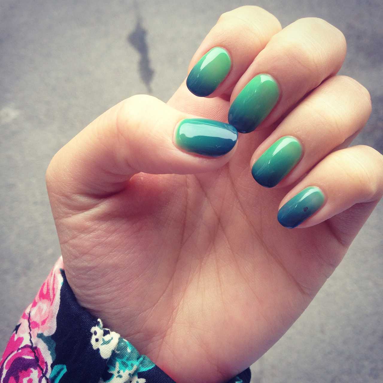 Маникюр зеленого цвета с техникой омбре – оригинальное и стильное решение для незаурядных личностей. Все цвета и оттенки зеленого идеально сочетаются в данной технике. Градиентный маникюр – это особая техника плавного перехода из одной цветовой гаммы в другую. Существует несколько разновидностей градиентного маникюра. Самый простой вариант – взять пять оттенков зеленого лака и поочередно покрыть каждый ноготок от самого темного к самому светлому.