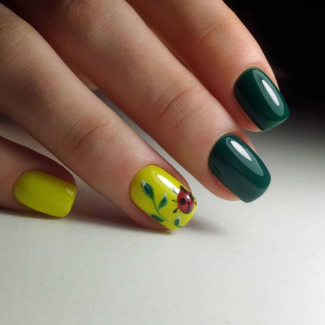 Желто-зеленая комбинация – это априори яркий и насыщенный маникюр короткие ногти. Это свежее сочетание больше всего подходит для лета и ассоциируется с фруктами: лимоном, сочным яблоком, киви. Именно поэтому сюда отлично впишутся фруктовые узоры или наклейки. Очень красиво смотрится желто-зеленый градиент – горизонтальная растяжка от ярко-лимонного к салатовому.