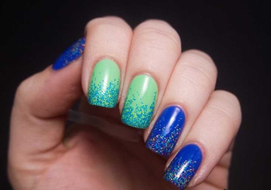 Зелено-синее и зелено-голубое сочетание на женских ноготках вызывают ассоциации с ясным весенним небом и сочной зеленью. Эти два оттенка не часто встретишь в маникюре одновременно, поэтому, воплощая подобную комбинацию в жизнь, надо быть весьма осторожным.