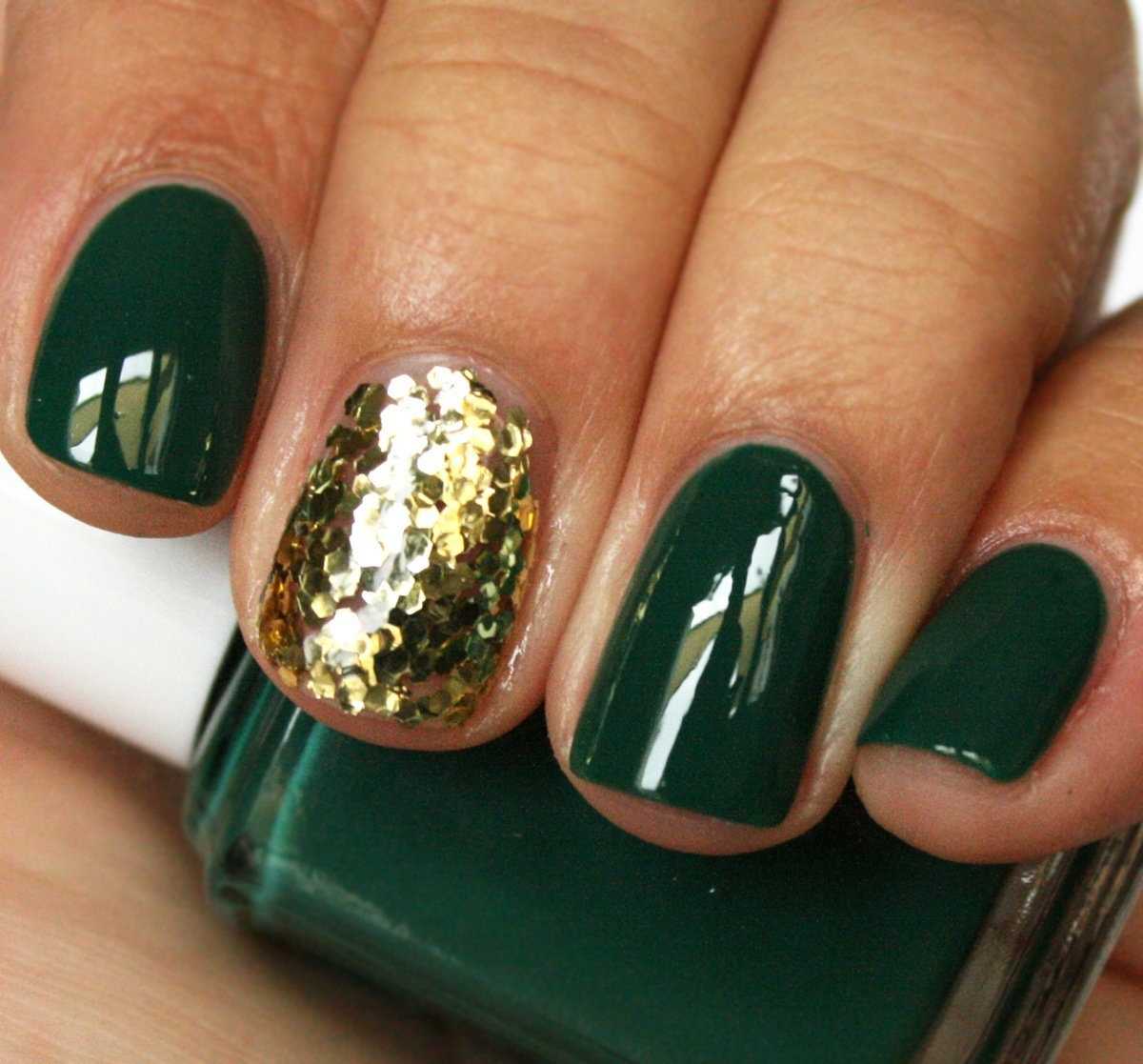 Великолепное решение – от крупных конфетти до блеск-пудры. Многие выбирают сдержанный блеск на некоторых участках или один-другой блестящий ноготок на руке, но присмотритесь к блеску на кончиках ногтей. Конечно, к глубокому зеленому больше подойдет бронзовый, золотой отлив. А мятный цвет благородно и свежо заиграет в сочетании с серебром.