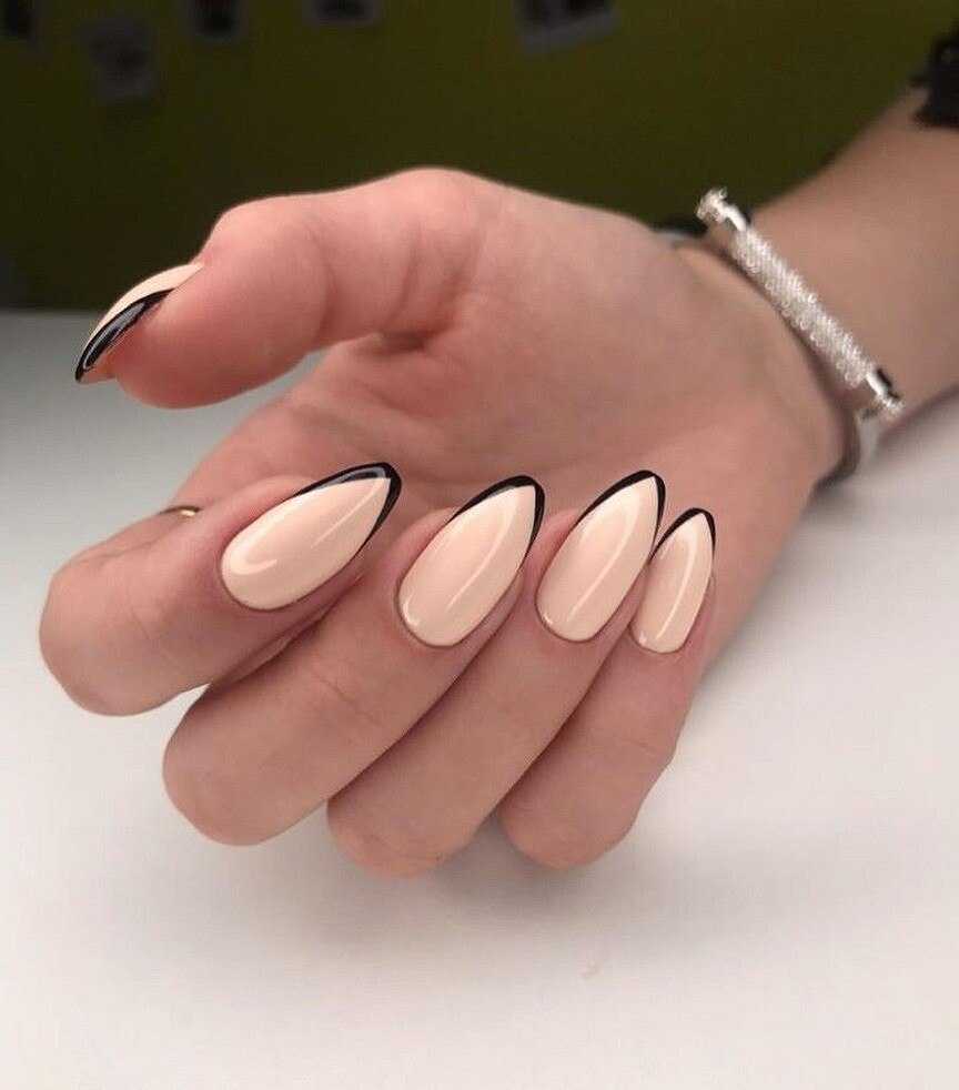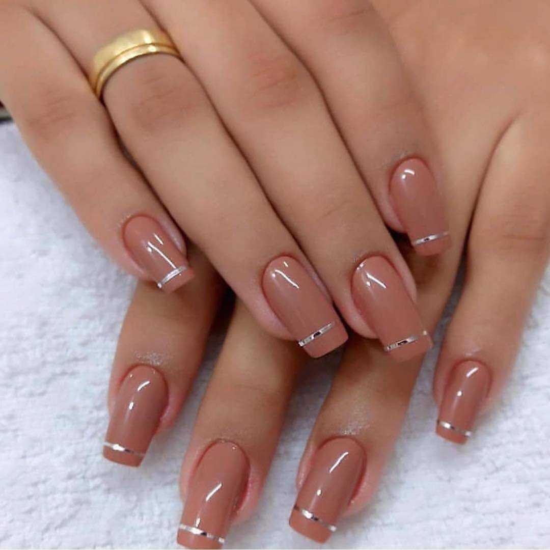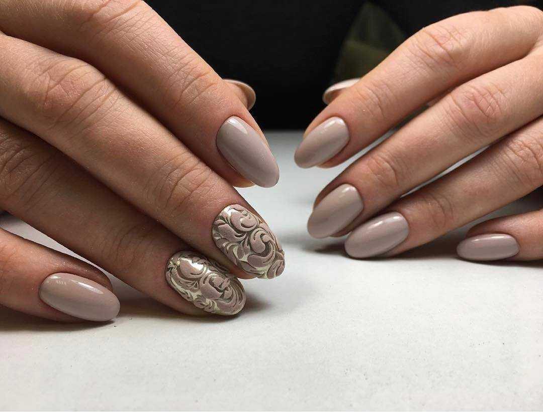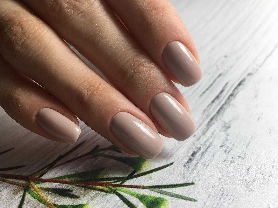 - бежевый. Чаще всего используются теплые тона лака с персиковым, оранжевым или коричневым подтоном. Такой маникюр выглядит максимально естественным и подходит для любой длины ногтей;