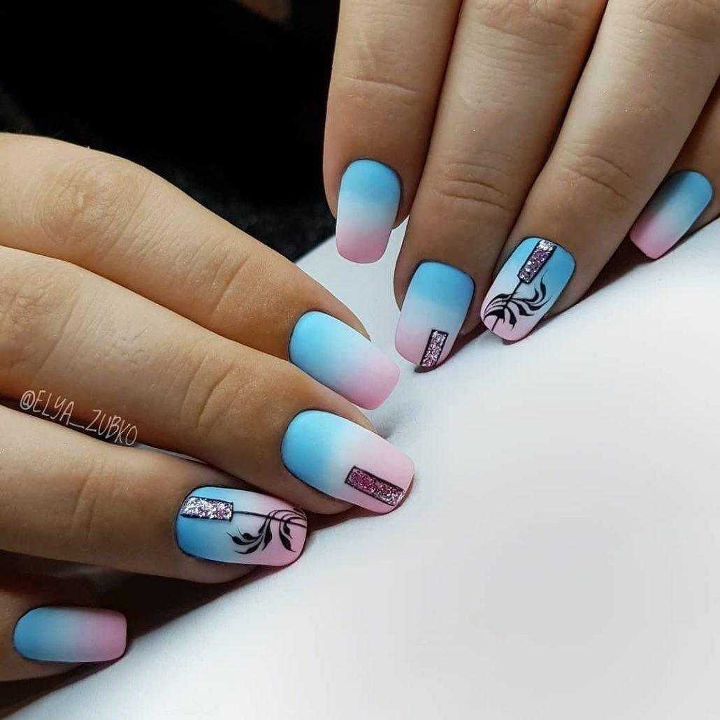 - голубой. Светлые оттенки этого цвета напоминают весеннее небо и делают маникюр изысканным и стильным. Вариант дизайна: омбре с переходом от светло-серого к небесно-голубому.