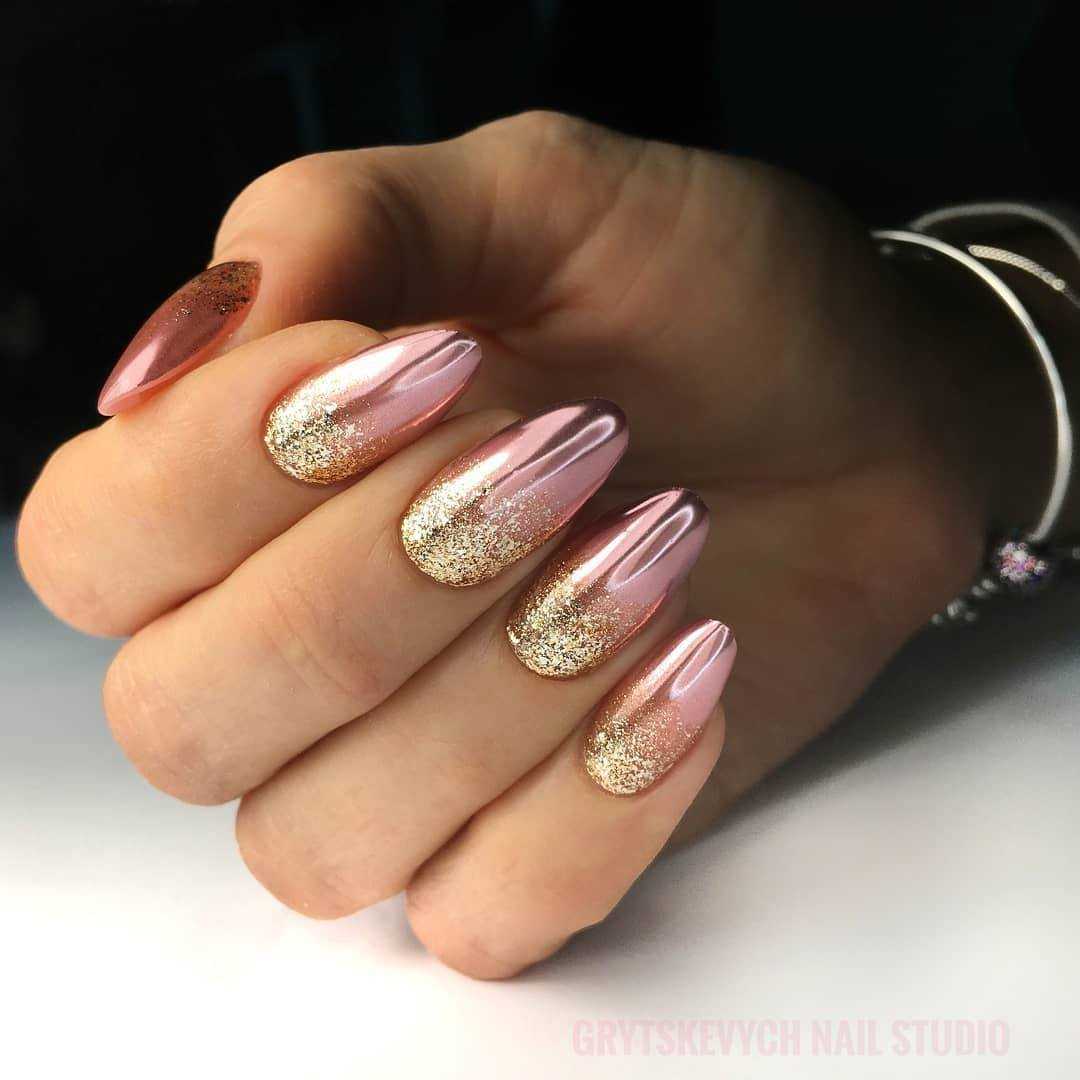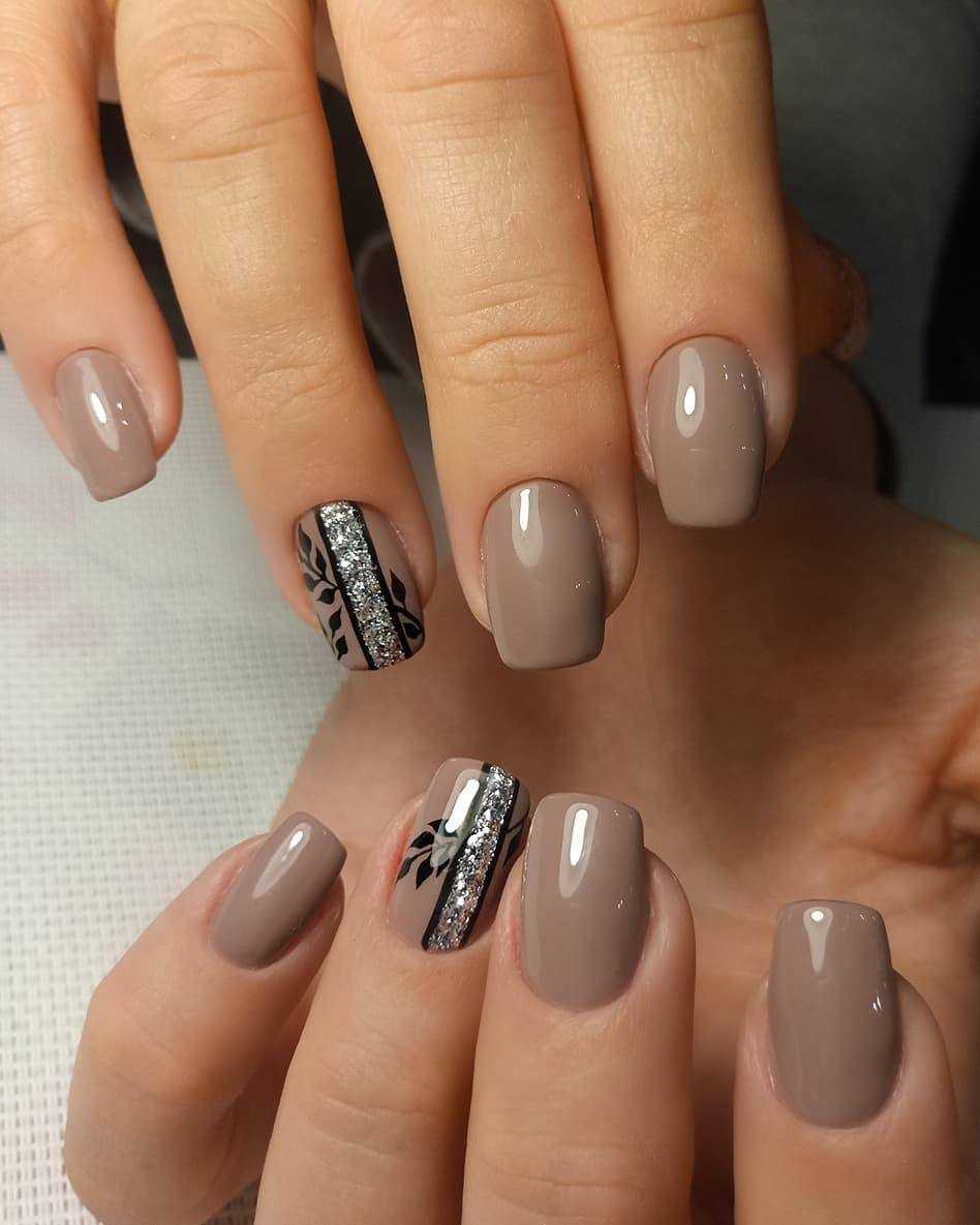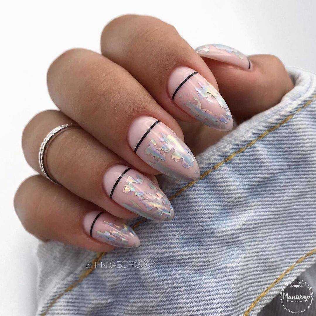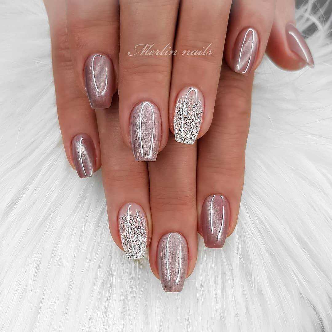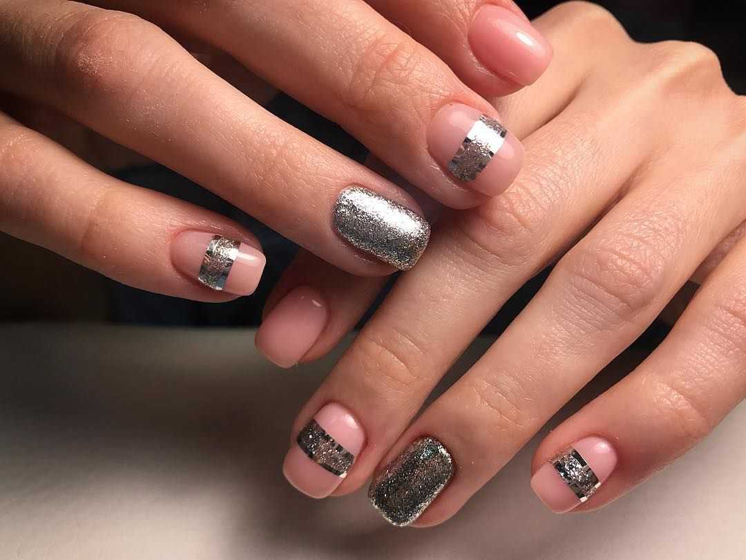 Нежные переливы блесток и однотонное нюдовое покрытие.
