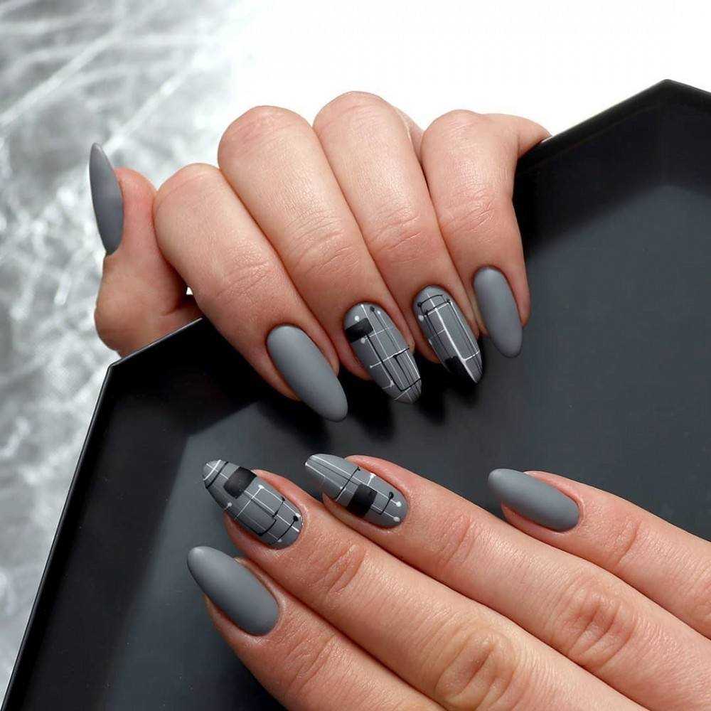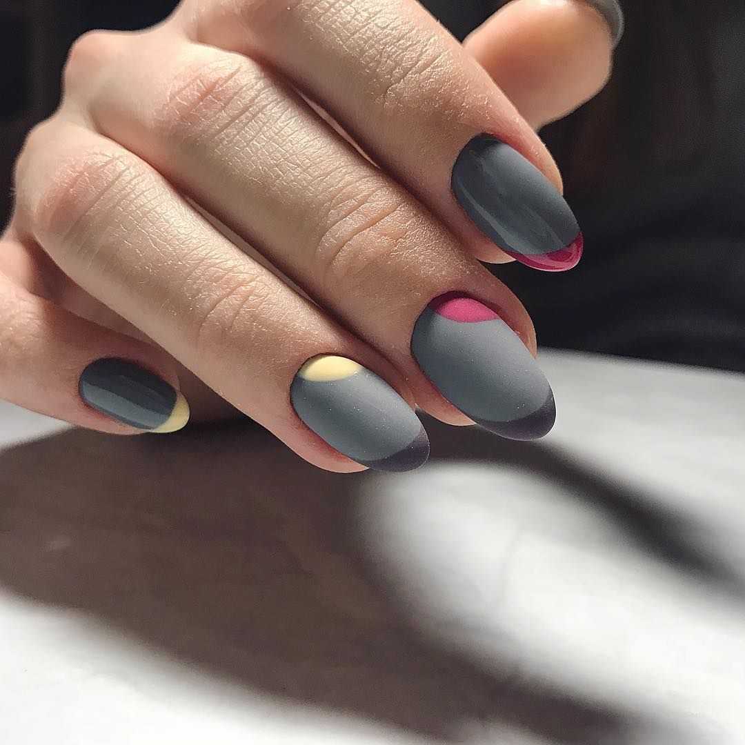 Дизайн коротких ногтей с геометрическими фигурами в матовых тонах.