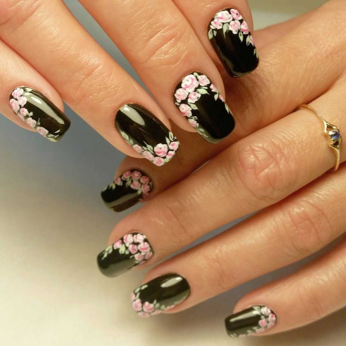 - затем с помощью черного лака и стемпинг пластины сделайте на всех или нескольких ногтях рисунки (рекомендуем выбирать флористическую тематику);