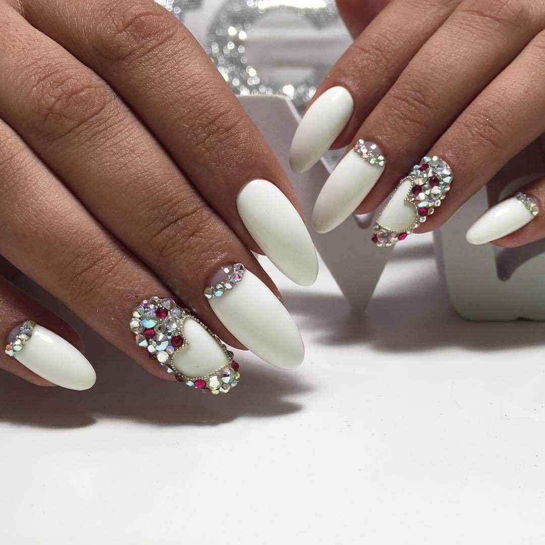Краска, которая сочетается с любым оттенком и даже в отдельности будет гармонично смотреться, — белая. С ним ноготки будут смотреться аккуратно, а дополнение в виде страз не сделает рисунок вульгарным.