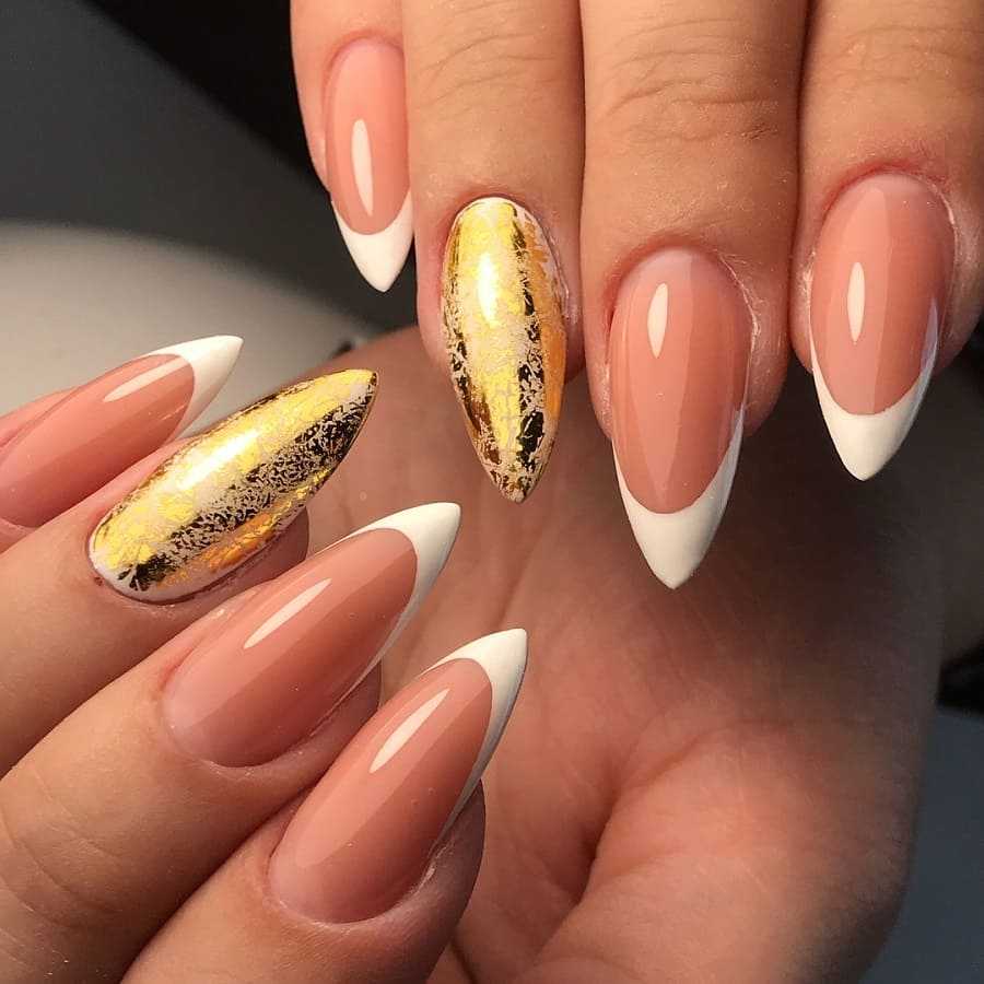 Дизайн для главной ночи в году может быть выполнен в технике металлика с использованием втирки или фольги, глиттерного сияния. Золото на пластинах получают как старыми способами, так и используя новинки в области нейл-арта. Варианты золотого маникюра:
