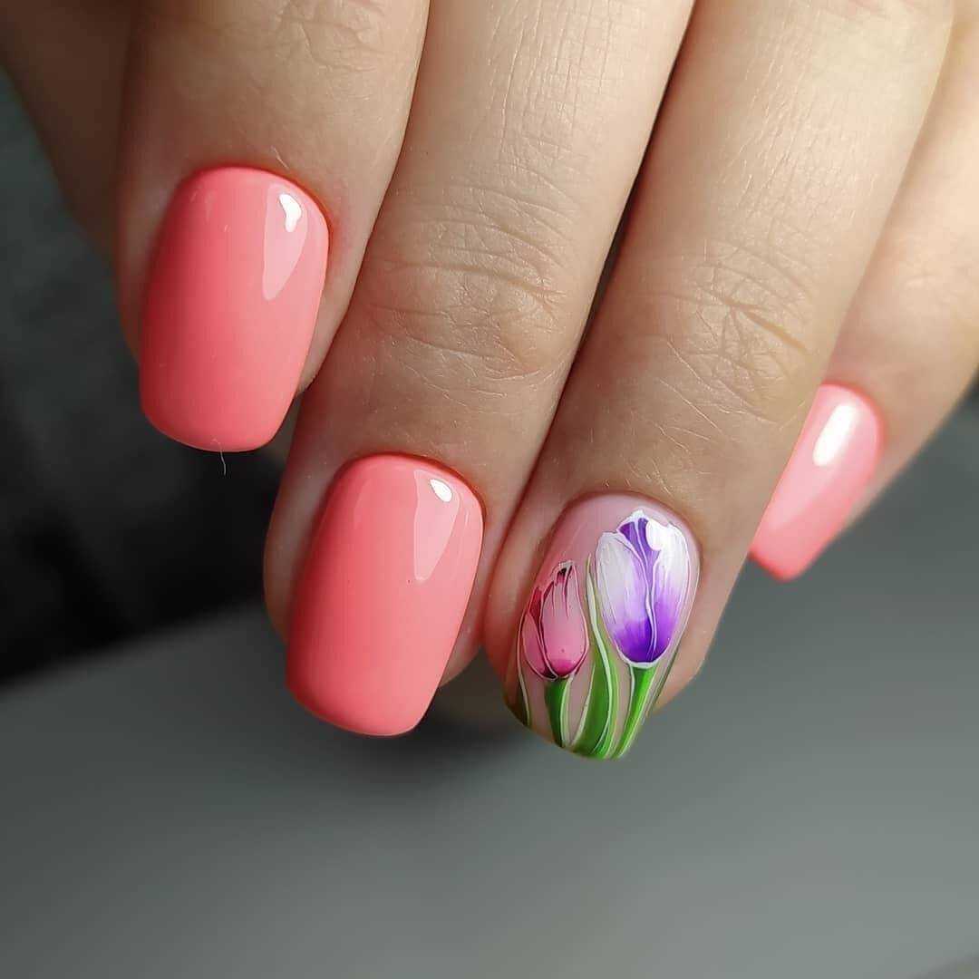 Любое упоминание о весне автоматически ассоциируется с теплыми лучами солнца и цветами, поэтому одной из актуальных идей для создания модного нейл-дизайна является использование в оформлении всевозможных цветочных мотивов. И в этом случае следует уточнить, что дизайнеры советуют не ограничивать свои желания и дать волю фантазии. Вы можете выбрать в качестве основного покрытия более лаконичный цвет лака и оживить пару акцентных ноготков яркой мимозой или нежными тюльпанами.