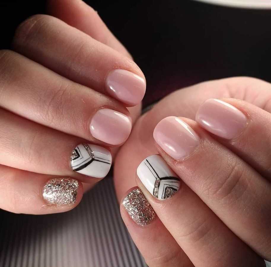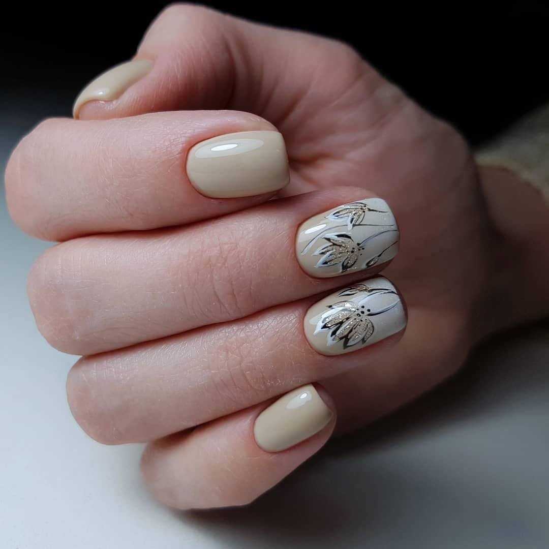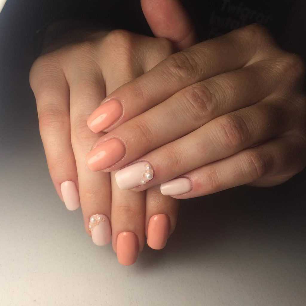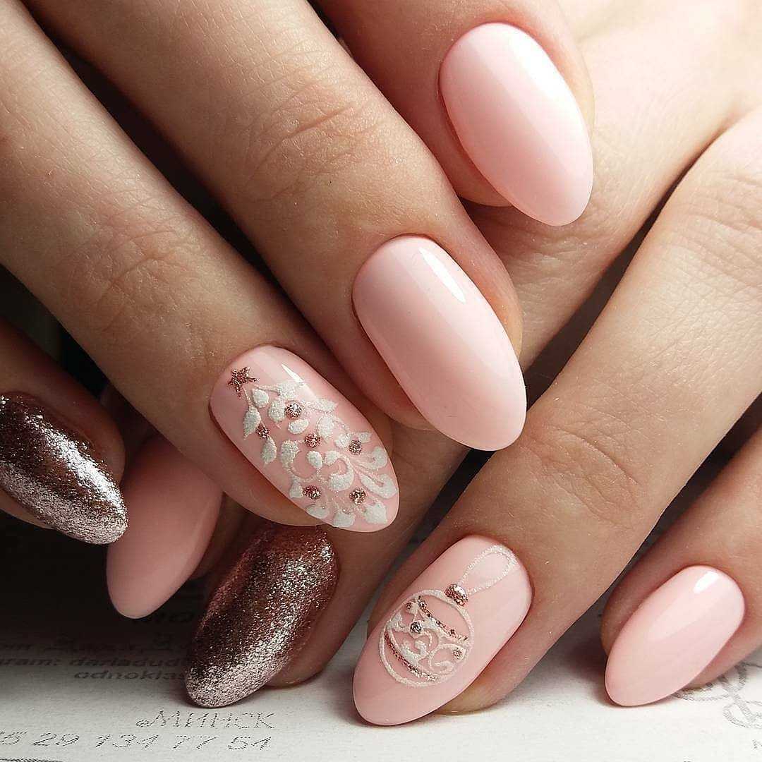 Такой вариант относится к популярному стилю nude. Он лаконичен и прост в исполнении. Интересно будет смотреться игра фактур, когда на матовой основе рисуется рисунок похожего оттенка, но с глянцем. Более праздничная вариация включает в себя различные стразы, блестящие элементы. Конечно не обязательно ими усыпать все ногти, тем более это будет выглядеть безвкусно. Лучше сделать такие акценты на 1-2 пальчиках. Тем самым вы добавите пикантную нотку в нейтральный дизайн и при этом не утяжелите его.