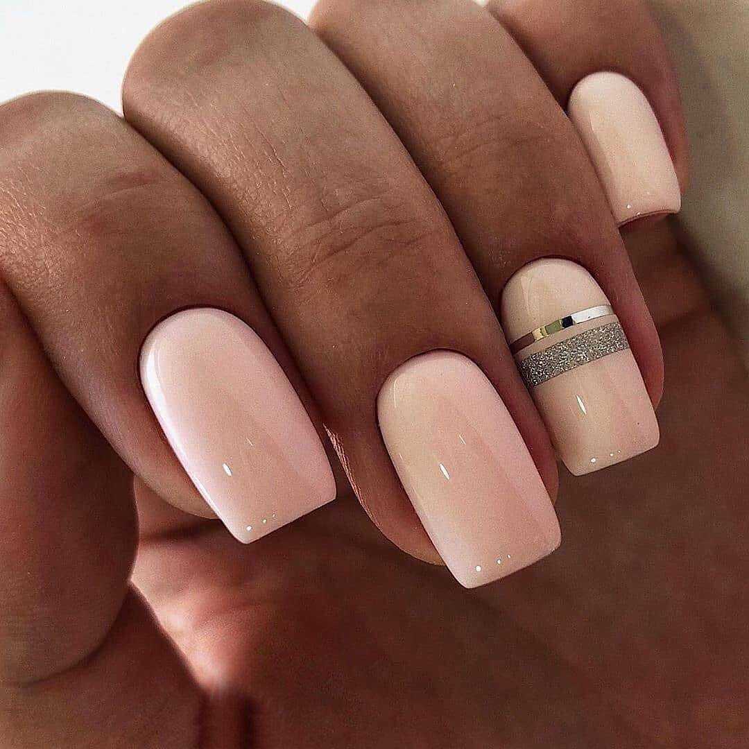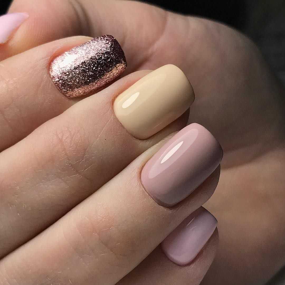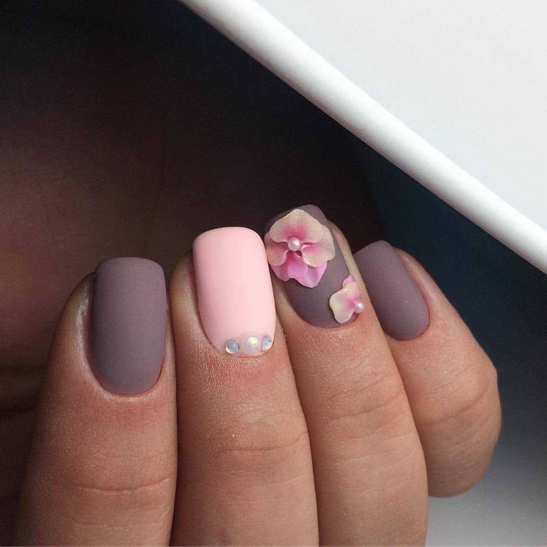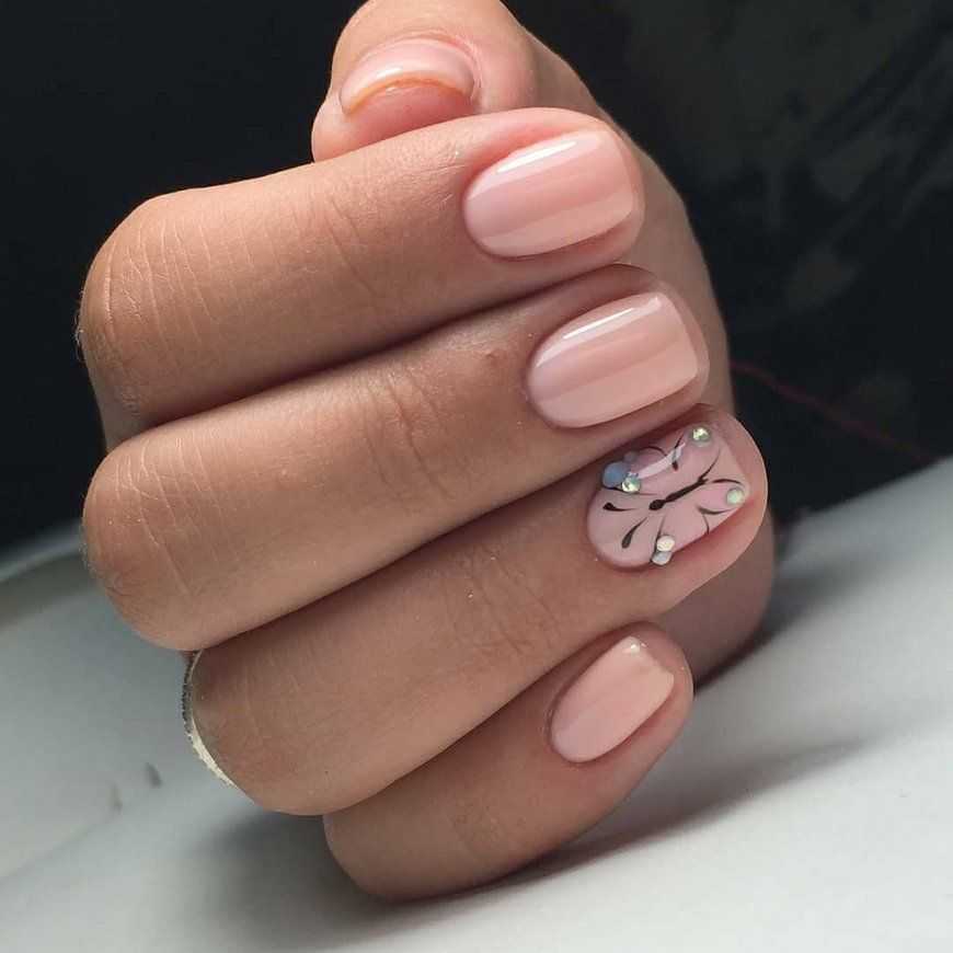 Такой вариант относится к популярному стилю nude. Он лаконичен и прост в исполнении. Интересно будет смотреться игра фактур, когда на матовой основе рисуется рисунок похожего оттенка, но с глянцем. Более праздничная вариация включает в себя различные стразы, блестящие элементы. Конечно не обязательно ими усыпать все ногти, тем более это будет выглядеть безвкусно. Лучше сделать такие акценты на 1-2 пальчиках. Тем самым вы добавите пикантную нотку в нейтральный дизайн и при этом не утяжелите его.