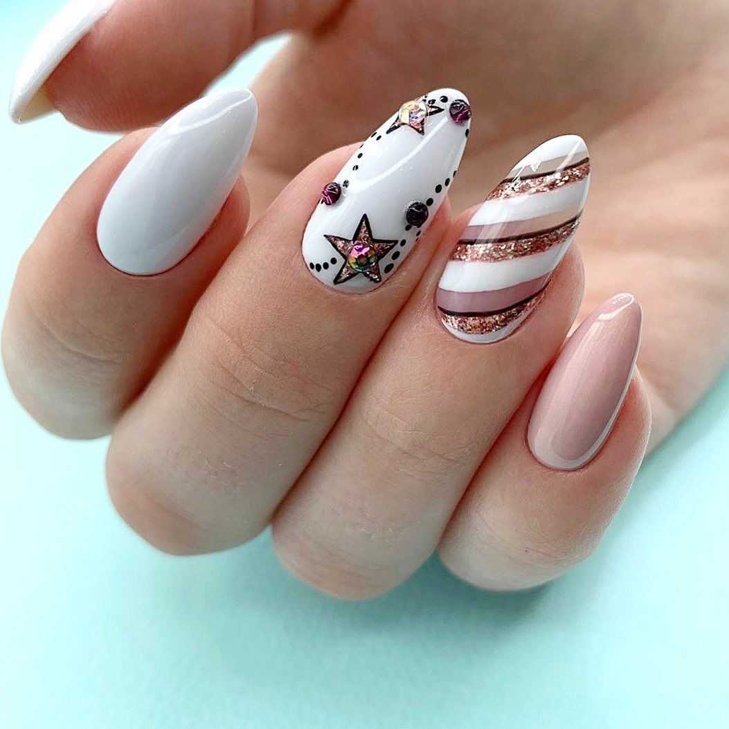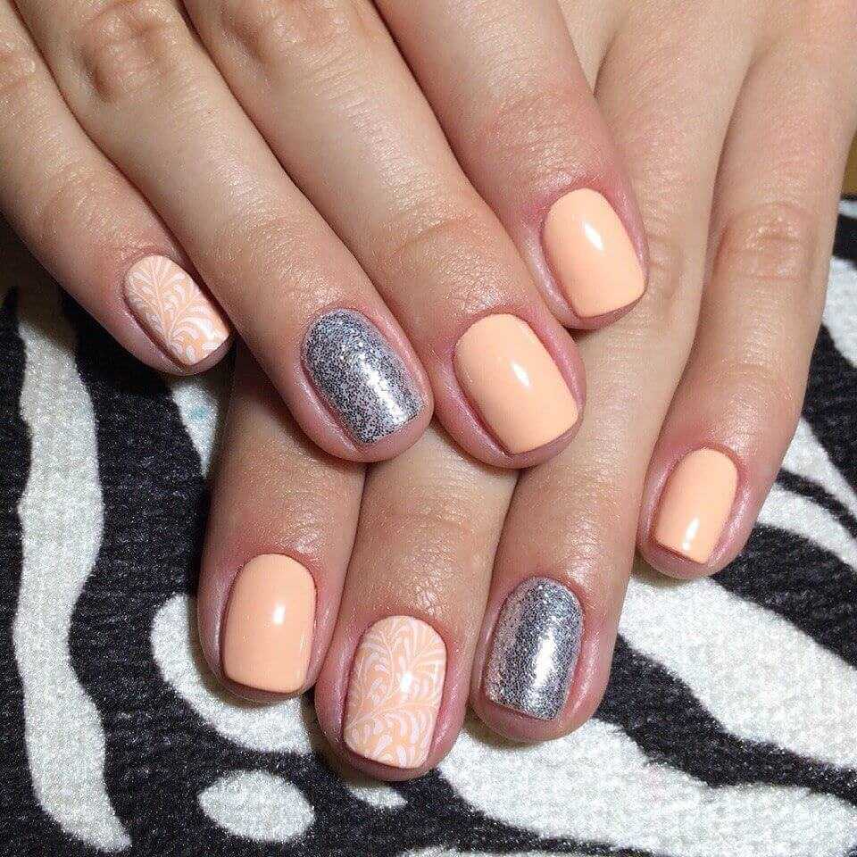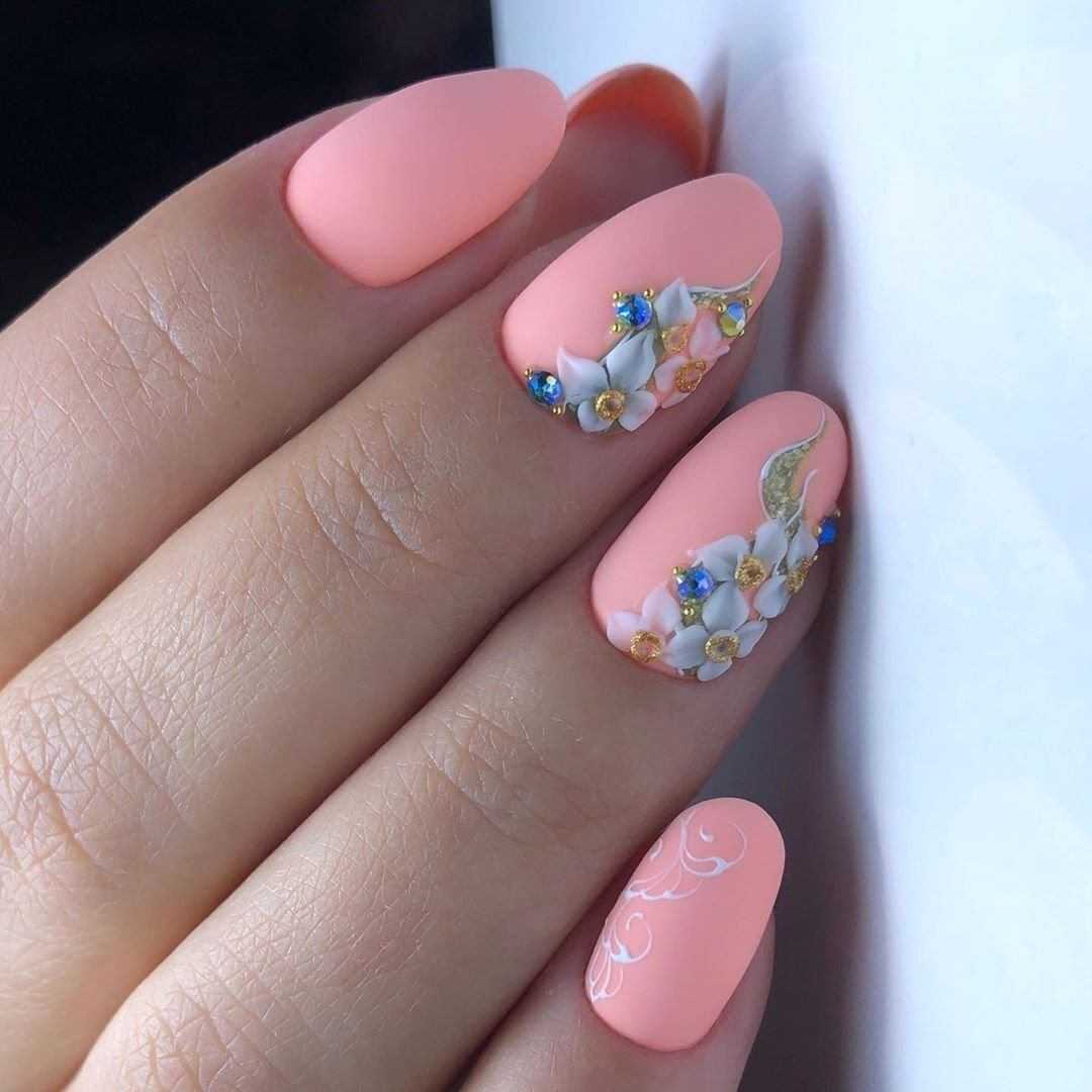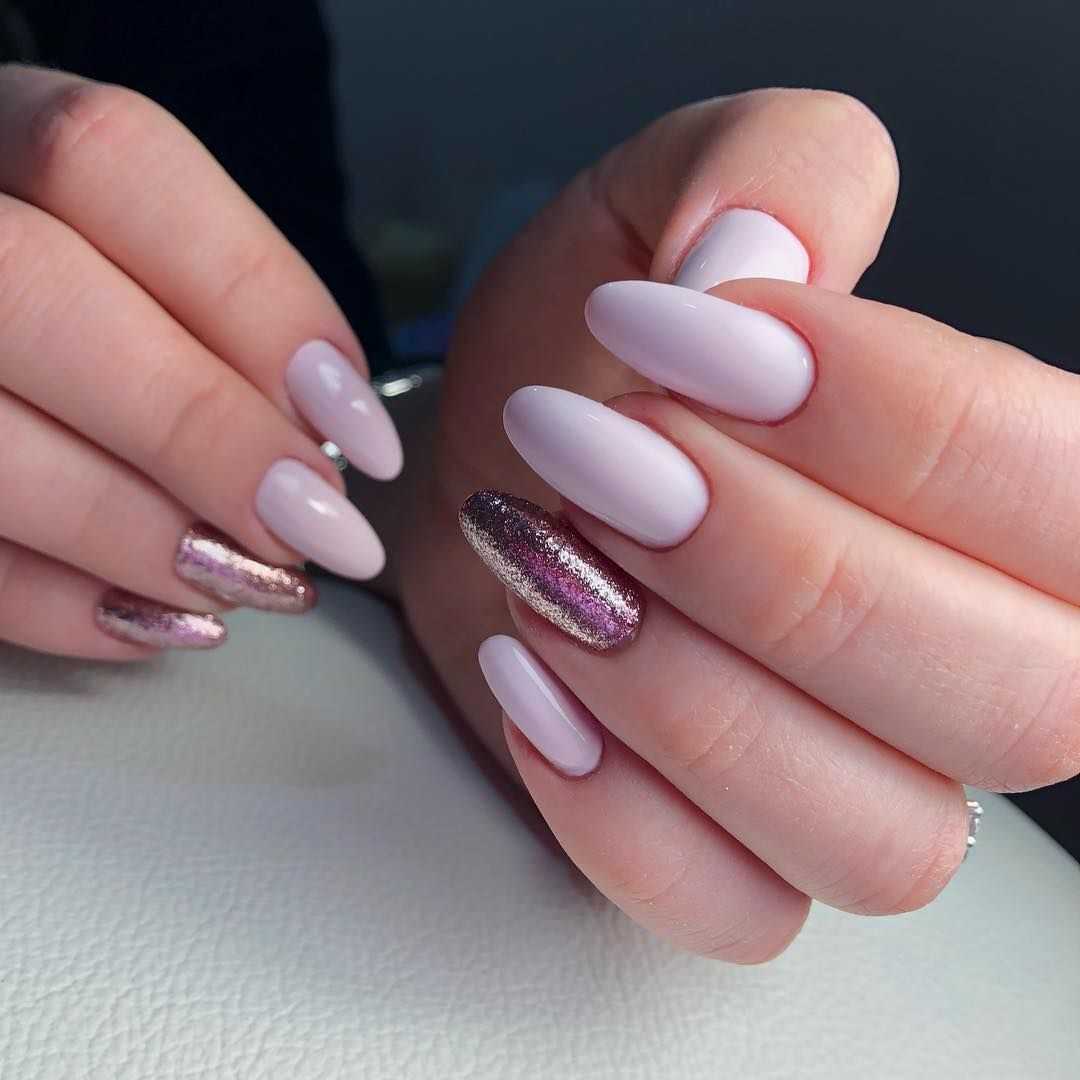 Такой вариант относится к популярному стилю nude. Он лаконичен и прост в исполнении. Интересно будет смотреться игра фактур, когда на матовой основе рисуется рисунок похожего оттенка, но с глянцем. Более праздничная вариация включает в себя различные стразы, блестящие элементы. Конечно не обязательно ими усыпать все ногти, тем более это будет выглядеть безвкусно. Лучше сделать такие акценты на 1-2 пальчиках. Тем самым вы добавите пикантную нотку в нейтральный дизайн и при этом не утяжелите его.