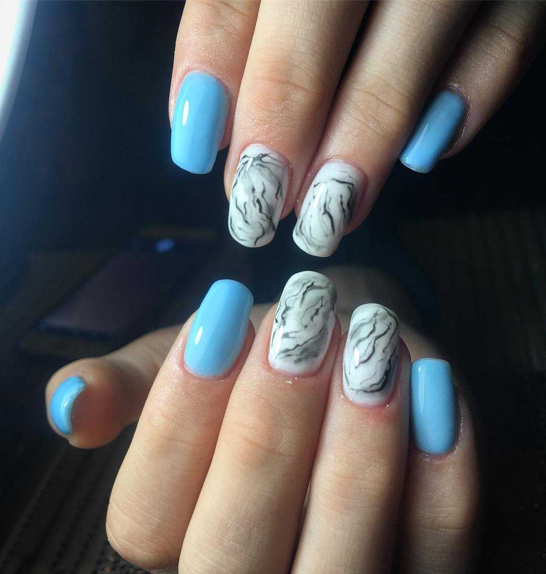 Мраморный эффект на короткую длину ногтевой пластины является настоящим пиком популярности в этом сезоне. Эффект переливающегося мраморного камня настолько понравился женщинам, что такой вариант делает хоть раз каждая из них
