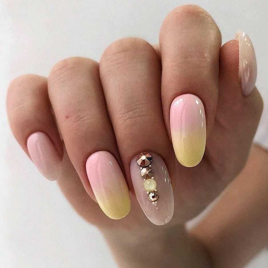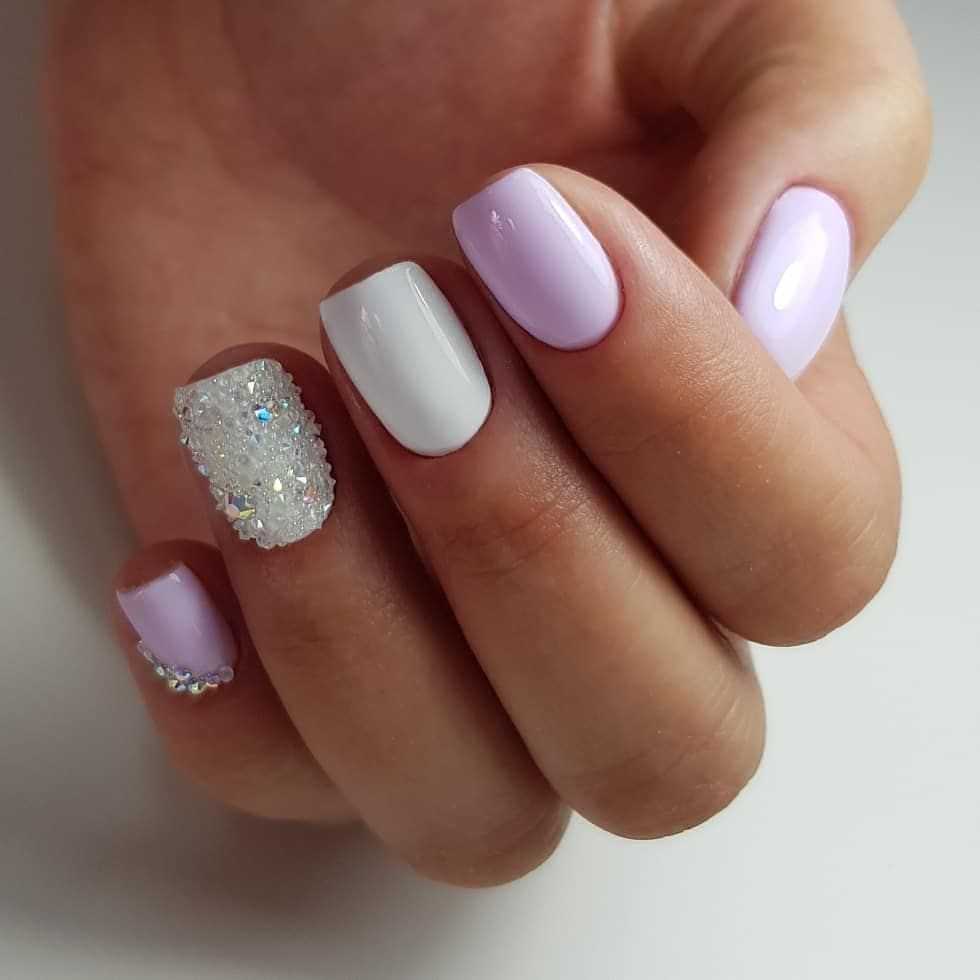 Такой вариант может стать отличным дополнением к вечернему наряду. Такой маникюр выглядит привлекательно, но в то же время в нем есть какая-то загадка, чистота и нежность. Такой вариант дизайна ногтей не скучен, но при этом не вычурен. Стразы могут выкладываться различными способами. Красиво выглядит сочетание крупных и мелких страз. С их помощью можно сделать акцент на лунке ногтя или же на кончиках. Также с помощью страз можно выделить по два ногтя на каждой руке, выложить из них цветы, сердечки или добавить к узору в качестве финального штриха. Вариантов огромное количество, в этом вы можете убедиться, просмотрев фото пастельного маникюра со стразами.