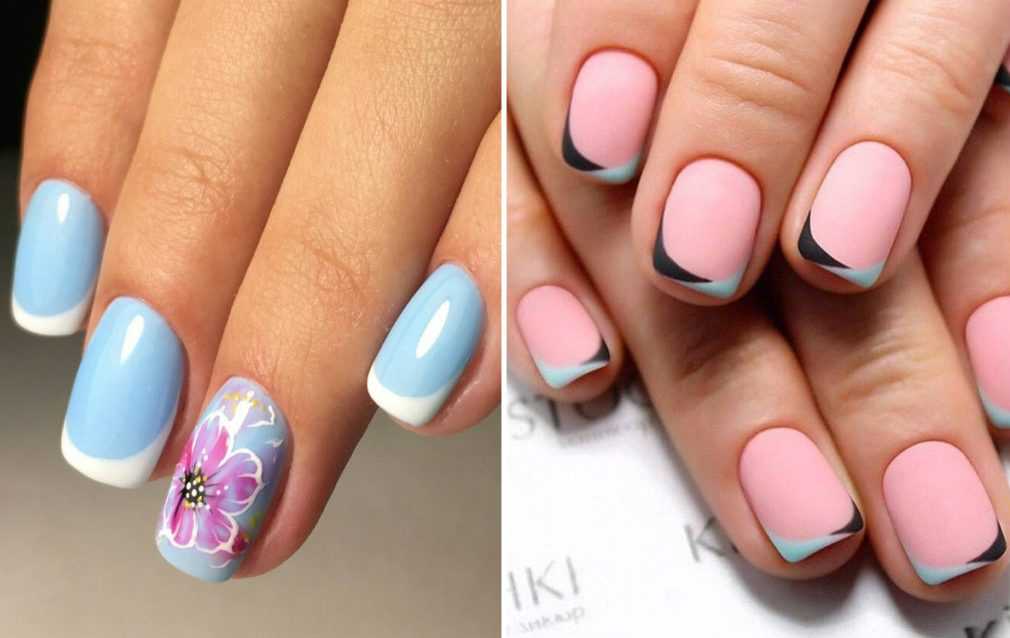 Еще один очень красивый вариант французского маникюра на лето — со сплошным покрытием. Носить их вместе — главный тренд этого лета. Можно добавить рисунки тех же тонов и результат будет намного оригинальнее.