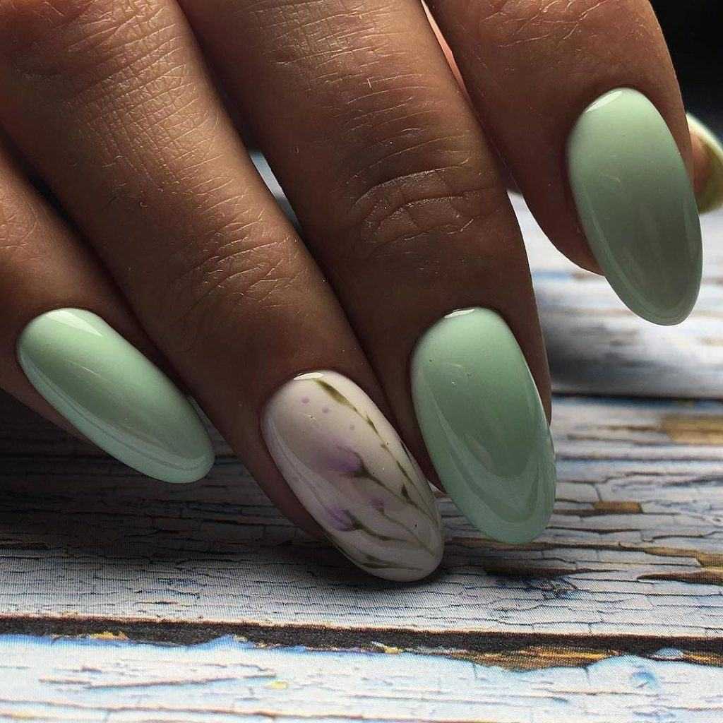 Вот предложение, с помощью которого можно совместить два летних нейл-тренда в одном маникюре. С одной стороны, французский маникюр с рисунком. На другом тот, что с точками. Вместе они смотрятся великолепно, а в зеленом цвете они очень лестны. Утонченность и оригинальность могут идти рука об руку в маникюре, и это яркий пример.
