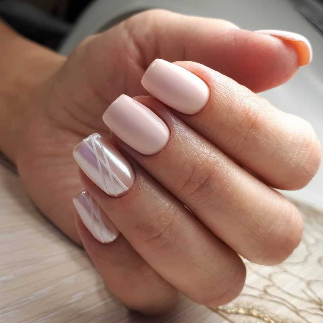 Модный светлый маникюр с жемчужной втиркой уже несколько сезонов остается популярным. Прелестный и очень нежный вариант светлых тонов с переливом придется по вкусу многим.