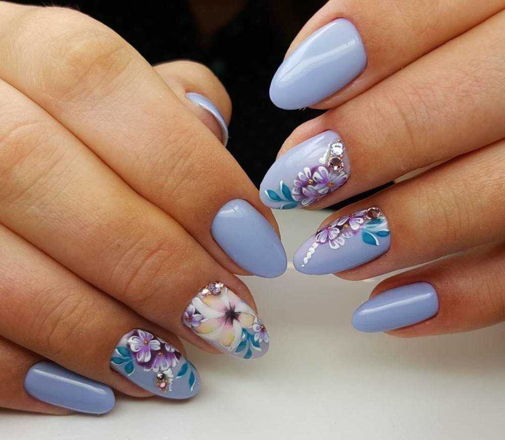 Голубой. Палитра оттенков достаточно богата — от выбеленного голубого до оттенка с примесями индиго. Дизайнеры предлагают использовать гель-лак с глянцевым эффектом. Самым стильным будет считаться тот нейл, в котором один или пара ногтей украшены или окрашены другим оттенком.