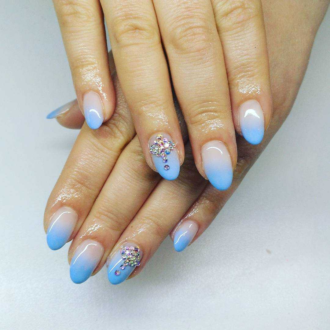 Маникюр для торжественного случая нередко украшают стразами. Градиент вполне подходящий фон для блестящих вкраплений. Главное не перестараться с количеством блестящих камушков, чтобы не выглядеть вульгарно. Хотя нейл-арт со стразами все еще входит в модные тренды, помним, что девиз нынешнего сезона минимализм!