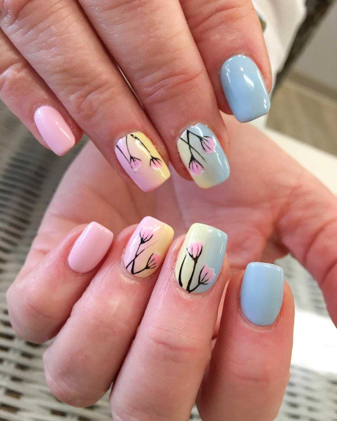 Женственный, мягкий, неброский дизайн тоже может быть трендовым. Однако лучше не использовать привычные персиковые, розовые и бежевые. Хорошая замена для градиента – сиреневый, голубой, бледно-желтый, светло-зеленый. Они тоже хороши для нежного маникюра омбре.