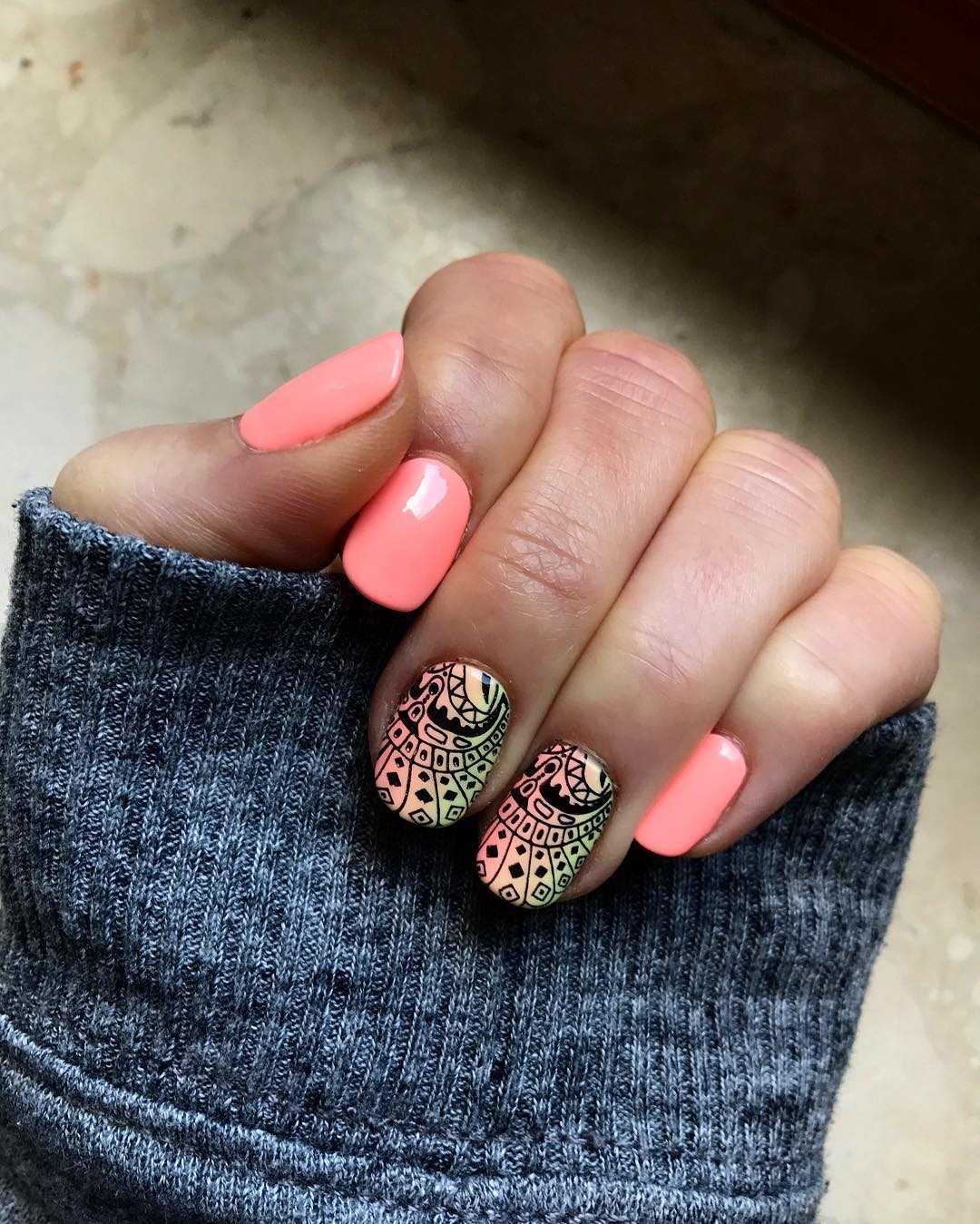 Фантазии модниц неиссякаемы. Омбре, так же как и обычное однотонное покрытие украшают трафаретами, орнаментами. Только надо прислушиваться к своему чувству меры. Многоцветие на ногте должно быть основным элементом маникюра. Украсить можно один-два пальчика. Чаще всего – это 3–4 пальцы.